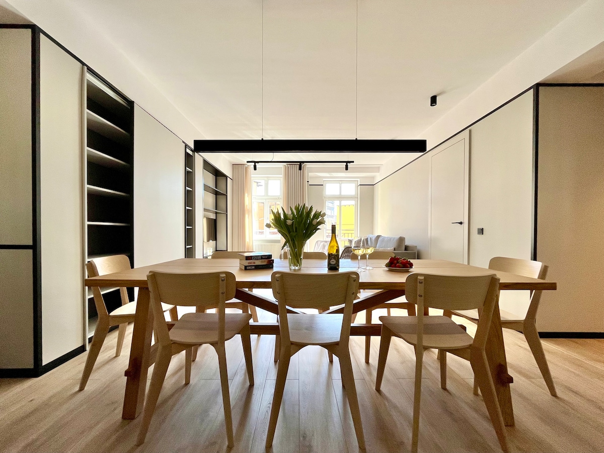 Stilingas ir patogus butas restauruotame miesto name senamiesčio centre. Šiuolaikiški, ryškūs pilkos spalvos atspalviai, suprojektuoti ir įrengti gerai žinomos architektūros studijos su aukštos kokybės apdailos medžiagomis. Butą sudaro du miegamieji su dvigule lova ir svetainė su virtuvėle ir sofa-lova. Du betoninių spalvų vonios kambariai su mediniais baldais, dideliu veidrodžiu, stilinga kriaukle ir furnitūra, dušu ir vonia.