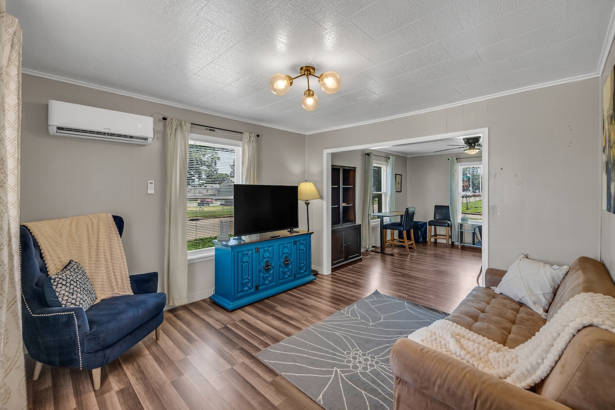 A few houses from Midtown’s pickle ball courts, you’ll find the Ivy Cottage. Charm and character are the highlight of this adorable property. The oversized sectional is the perfect place to cozy up and watch your favorite show on the Smart TV. Or serve dinner in the dining room with French doors that open to the patio. In the back you’ll find a hot tub, smart TV, couch, dart board, wine fridge, cornhole, etc. Plush beds await when you’re ready to call it a night. *Fireplace is not working.