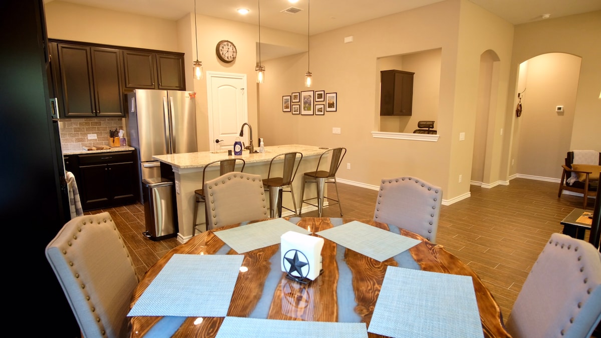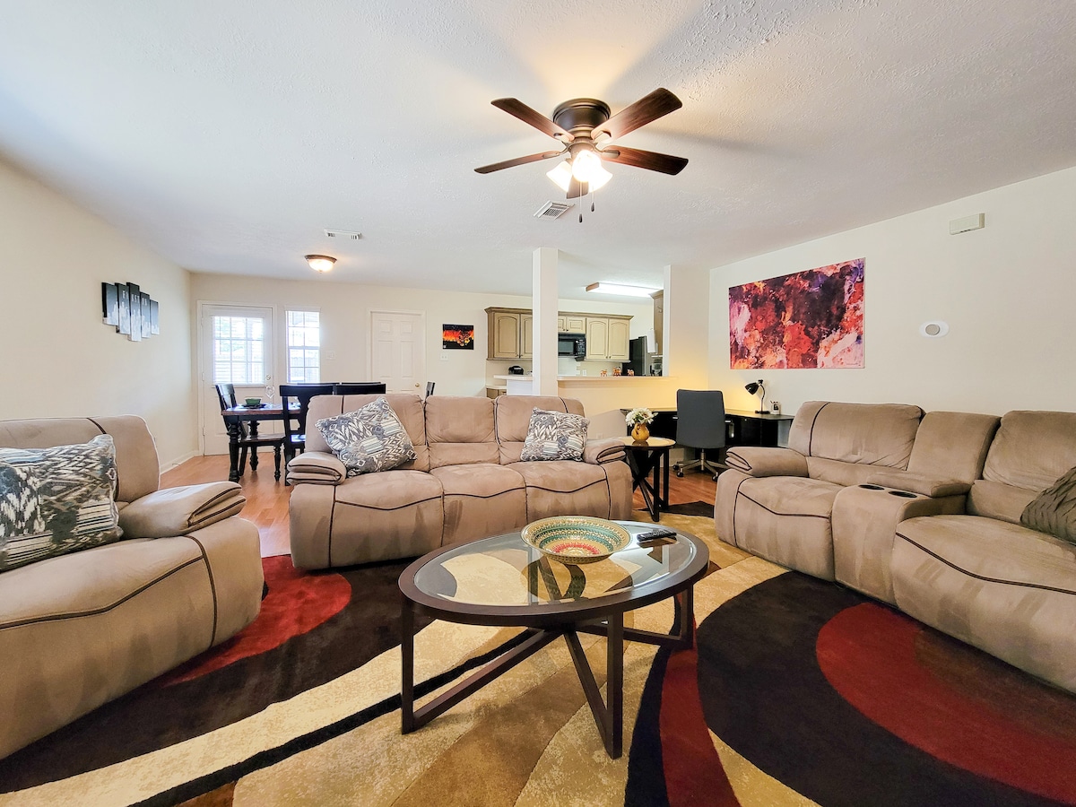 Relax with friends or family at this tranquil 4-bedroom home—perfect for larger groups. Need to stay productive? Two dedicated workspaces are ready for you. Keep active in the fitness area with a treadmill, bike, yoga mat, bench, ball, and dumbbells. Outdoors, kids can enjoy the spacious swing set for climbing, sliding, and play, while adults can fire up the grill, watch the game, or enjoy a round of pool. A great space to relax, have fun, and stay productive!