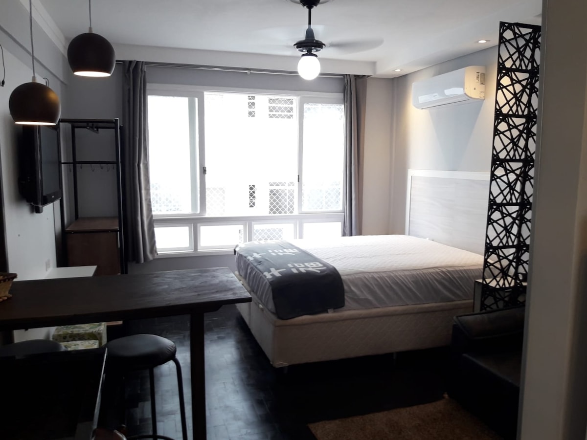 Aukšto standarto moderni studija Itararé paplūdimyje! Puiki vieta. - 5 min. nuo funikulieriaus - Priešais Asa Delta oro uostą. - 20 minučių nuo Porčato salos - 15 min. Milijonierių paplūdimio - 15 min. iki José Menino paplūdimio - 15 min. nuo savivaldybės Orquidário de Santos - 15 min. kelio nuo Santoso povandeninio laivo - 5 min. kelio nuo Habibo. Elementai; - Skaitmeninis laikrodis - Wi-Fi - Su oro kondicionieriumi -Micro-ondas - Kafeteira -Secador - Televizorius su „Netflix“ - Baldai ir indukcinė viryklė Patalynė -Talhas