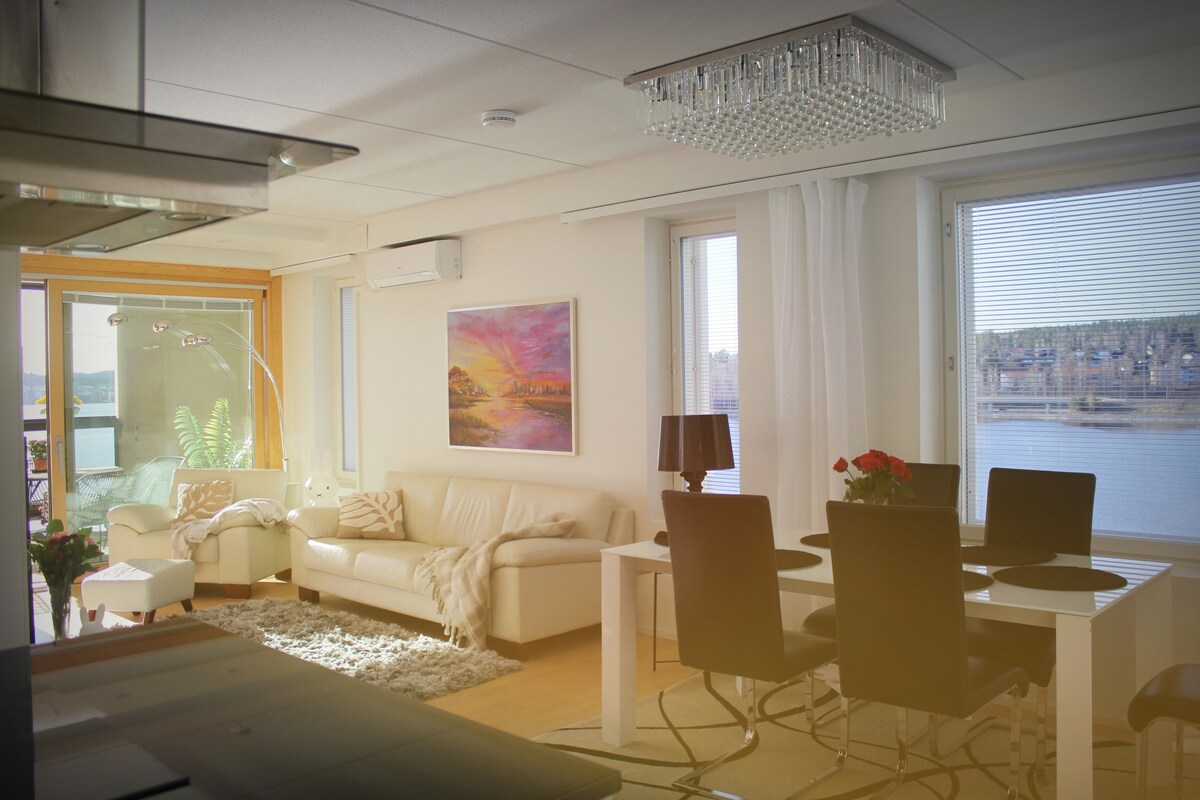Erdvi 74 m2 dviejų miegamųjų, svetainės ir saunos patalpa yra puikioje vietoje, šalia paviljono ir Jyväskylä uosto, vos už 200 metrų nuo kelionių centro ir miesto centro. Šalia yra taikomųjų mokslų universiteto ir universiteto padaliniai. Pastatas ir visi baldai nauji. Yra 2 miegamieji, kiekviename po 2 aukštos kokybės lovas, taip pat išskleidžiama sofa-lova / čiužiniai. Gražus didelis balkonas su vaizdu. Pirtis ir 2 tualetai. Puikiai įrengta virtuvė. Galima užsisakyti vietą garaže.