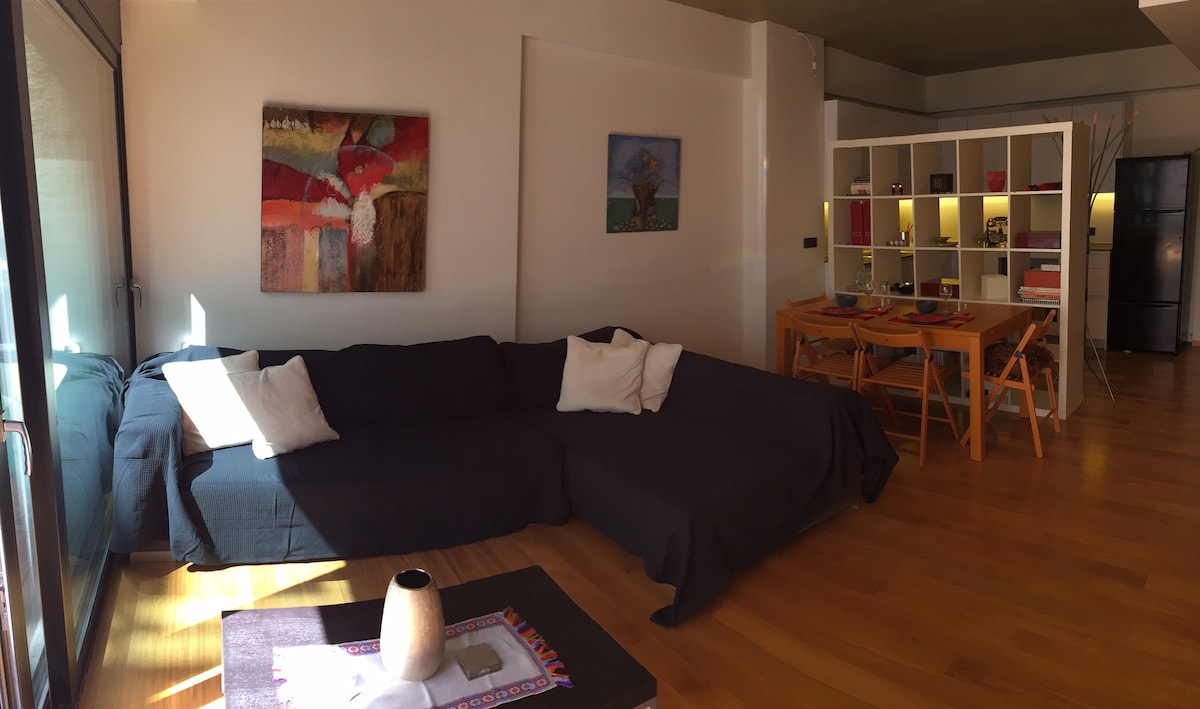 100 kv. m 2 miegamųjų butas yra privilegijuotame gyvenamajame pastate 5-ame aukšte priešais erdvų parką. Tai saulėtas butas su visais kambariais, iš kurių atsiveria vaizdas tiesiai į parką ir toliau matomas vaizdas (balkonas turi tiesioginį priėjimą prie šio vaizdo), be kelio tarp įėjimo į pastatą ir parką , labai ramioje vietoje, vos už kelių žingsnių nuo vietinio naktinio gyvenimo. Daugiau informacijos: Butas: Kai įeinate į butą (renovuotas 100 kv. m), kairėje yra prieškambaris su atvira virtuve ir baras su kėdėmis. Virtuvė pilnai įrengta (su mikrobangų krosnele ir indaplove). Priekyje yra erdvi svetainė su 4K išmaniuoju televizoriumi (įskaitant neflix kanalą), valgomasis (didelis medinis ovalus stalas su 8 kėdėmis ). Tiek sėdimojoje, tiek valgomojoje zonoje galite mėgautis parko vaizdu ir ramia atvira erdve ,be nieko primenančių, kad esate didelio miesto centre. Toje vietoje taip pat yra biuro stalas, skirtas naudoti nešiojamąjį kompiuterį ir kt. Dešinėje (yra stiklinės durys, galinčios užtikrinti privatumą) yra moderni, patogi sofa-lova, kurioje gali apsistoti 2 žmonės (210x140 cm). Sofa sėdimojoje zonoje, valgomasis stalas, kėdės ir kėdės neseniai buvo nupirkti iš „KARE“ dizaino parduotuvės. Šalia virtuvės yra nedidelis koridorius, kuris atskiria sėdimą, valgomojo ir virtuvės zoną nuo likusio buto. Kai atidarote duris į miegamuosius ir tualetą ,vonios kambarį, kairėje yra nedidelis tualetas, o dešinėje - vienas miegamasis su 2 viengulėmis lovomis (visiškai nauji ekologiški čiužiniai papildomam miegui, po 200 x 90 cm arba 3 'x 6’ 66 ’’pėdų), kuriuos galima pritvirtinti ,drabužių spinta ir prieiga prie balkono. Toliau dešinėje yra pagrindinis miegamasis su 200 x 200 "super king" dydžio lova (visiškai naujas ekologinis čiužinys, skirtas papildomam komforto miego dydžiui 183 x 203 cm arba 6’ x 6’ 66’’ pėdų) su spinta ir prieiga prie balkono. Priešais yra didelis vonios kambarys su dušu ir vonios įranga, o koridoriaus gale - maža saugykla, kurioje yra skalbimo mašina. Esame pasiruošę padėti viešnagės metu! Centrinis Atėnų rajonas, kuriame galite lengvai pasivaikščioti po apylinkes ir susipažinti su vietinėmis parduotuvėmis, galerijomis, mažais teatrais, restoranais ir barais. Kallimarmaro ir Kolonaki taip pat turi kelis parkus. Butas lengvai pasiekiamas iš oro uosto ir uosto. Metro stotis (Evangelismos - mėlyna linija ) turi tiesioginį susisiekimą su oro uostu ir yra 10 minučių pėsčiomis nuo buto. Jei pasirinksite metro ar autobusą, vežantį sunkų bagažą, rekomenduojama važiuoti taksi iš autobusų/metro stoties į butą (mažiau nei 5 min., Kaina 3,20 eur), nes jis yra kalnuose (pvz., Kai kurie žingsniai, jei norite sutaupyti atstumą) , o tai taip pat yra puikus horizontas ir vaizdas į parką. Iš Pirėjo uosto maždaug 40 minučių kelio traukiniu važiuojate link kifisia (žalia linija), o Monastiraki stotyje pakeiskite mėlyną liniją į oro uostą arba doukisis plakentias ir išvažiuokite į evagelismos stotį. Už 100 m nuo buto yra privati vieta. Transporto priemones (iš/į oro uostą už labai konkurencingas kainas arba vienos dienos keliones ar ekskursijas) taip pat galime suorganizuoti paprašius. Visų lovų čiužiniai yra ECOSLEEP (naujos technologijos BIOREST tipo sluoksniai su pažangiomis putplasčio medžiagomis, pvz., atminties putos papildomam komforto miegui) Atvira erdvė yra 12 metrų ilgio balkonas, kurį galima pasiekti iš visų miegamųjų ir sėdimų vietų su vaizdu į parką. Yra stiprus Wi-Fi signalas. Pastate yra 2 liftai (1 normalus ir 1 mažas) su įėjimu į aukštą (5). Yra privati automobilių stovėjimo aikštelė, esanti už 100 m nuo buto. Atvirose erdvėse (balkone) leidžiama rūkyti.