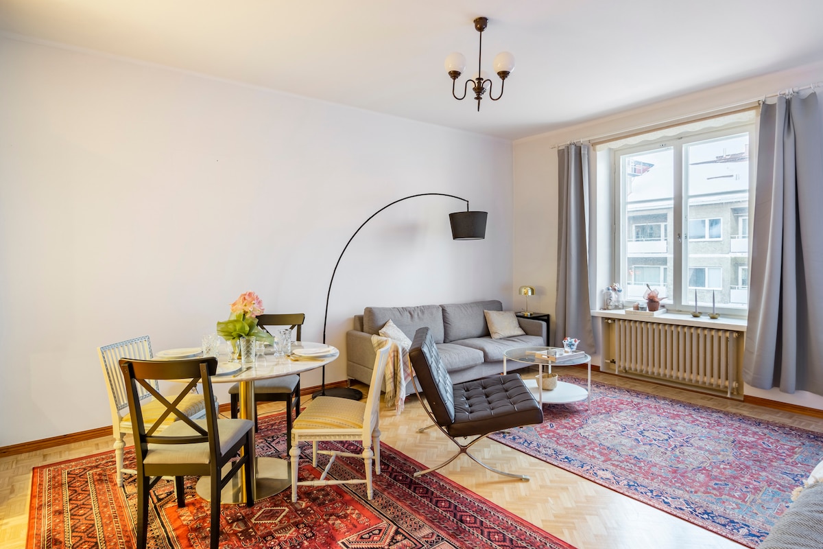 Ramus 43 kv. m butas Helsinkio dizaino rajone – vos už 30 metrų nuo tramvajaus stotelės ir 5 min. pėsčiomis nuo miesto centro ir centrinės geležinkelio stoties. Dizaino rajone yra daug mielų butikų ir parduotuvių netoliese. Pilnai įrengta virtuvė, svetainė/miegamojo zona su dvigule lova ir sofa-lova dviems. Pirmame aukšte taip pat yra ideali vieta apsistoti nejudantiems svečiams. Tinka porai, šeimai arba nedidelei draugų grupei (2-4 keliautojams).