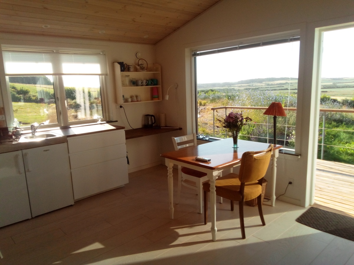 Nedidelis jaukus, kaimiškas namas su šiltnamiu. Namas yra mūsų šiaudinio namo priestatas, esantis pietinėje miško pusėje Apsuptas didelio sodo. Namelyje yra dvigulė lova, sofa, kavos staliukas ir kopėčios į nedidelį palėpį. Namelis šildomas malkomis kūrenama krosnele, malkos įskaičiuotos. Paprasta virtuvė, bet galima pasigaminti karštą maistą. Tualetas ir vonia pagrindiniame name, tiesiai prie įėjimo iš svečių namų. Atskiras tualetas ir vonia, bendri su šeimininkais. Namas yra gražiai įsikūręs, netoli fjordo, jūros, Thy nacionalinio parko