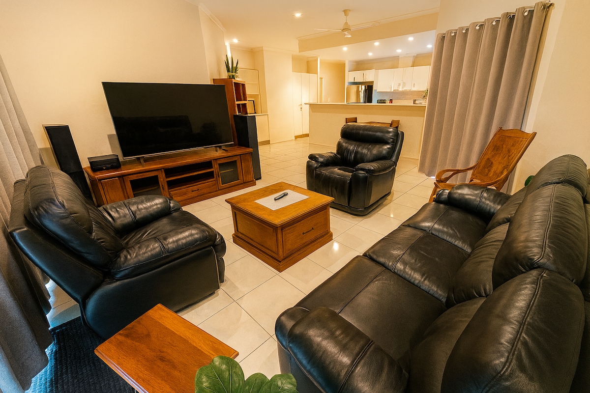 Dviejų miegamųjų butas su skalbykla ir virtuve [-1 aukštas, įėjimas į laiptus] Miega 4 žmonės - dvigulė lova kiekviename kambaryje [papildoma viengulė už kainą] Aircon, Ventiliatorius, 50colių išmanusis televizorius, viso dydžio šaldytuvas, arbata/kava, rašomasis stalas, Wi-Fi, patalynė ir rankšluosčiai, plaukų džiovintuvas, skrudintuvas, virdulys, stalo įrankiai, viryklė, mikrobangų krosnelė, lygintuvas ir lenta, dvivietė sofa, arbatos ir valgomojo stalas, dulkių siurblys Namų tvarkymas [ne savaitgaliais/švenčių dienomis] Tinka augintiniams [taikomi mokesčiai] Baseinas ir restoranas vietoje. Reikia ko nors? Apsilankykite registratūroje arba paskambinkite mums visą parą.
