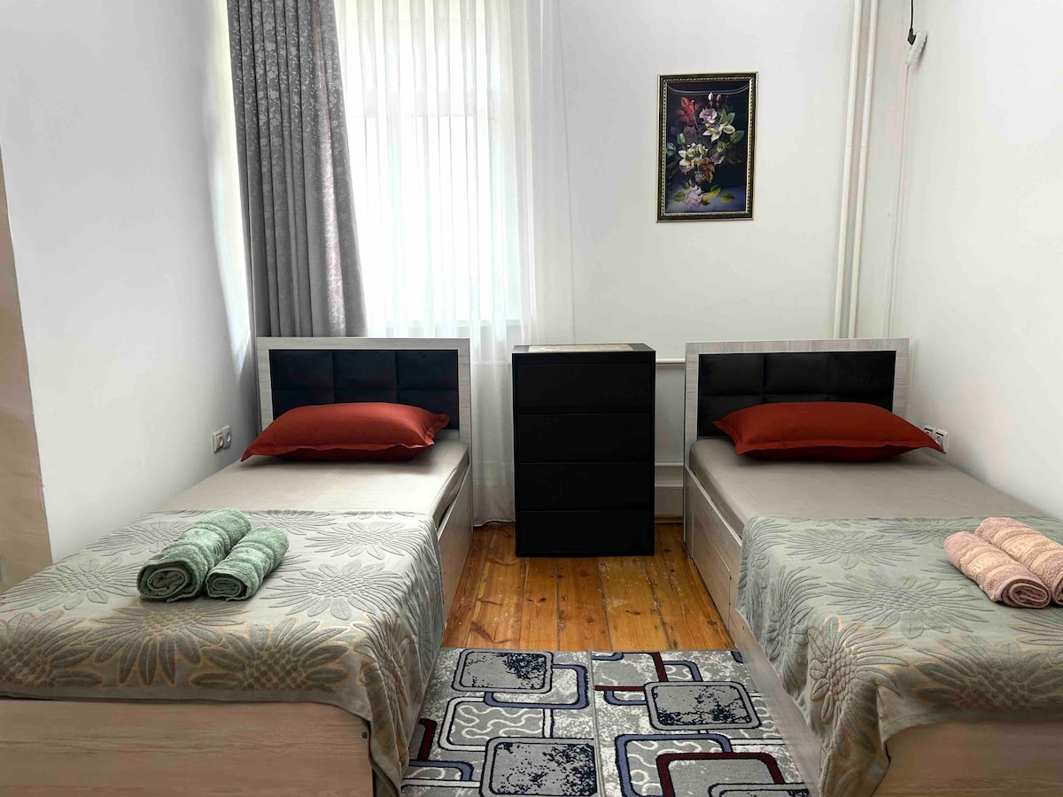 Jaukus ir švarus butas labai patogioje vietoje turistams ir oro uosto tranzitiniams keleiviams - už 5 min. kelio nuo oro uosto ir dviejų traukinių stočių. Artimiausia autobusų stotis yra už 100 metrų. 5 min. taksi iki miesto centro arba 10 min. viešuoju transportu. (5 min. kelio autobusu nuo metro stoties „Tashkent“) Vystyta zona aplink butą, kur galite rasti viską. Netoliese yra kelios didelės ir mažos maisto prekių parduotuvės, taip pat įvairios kavinės, restoranai ir pan. Neribotas didelės spartos internetas.