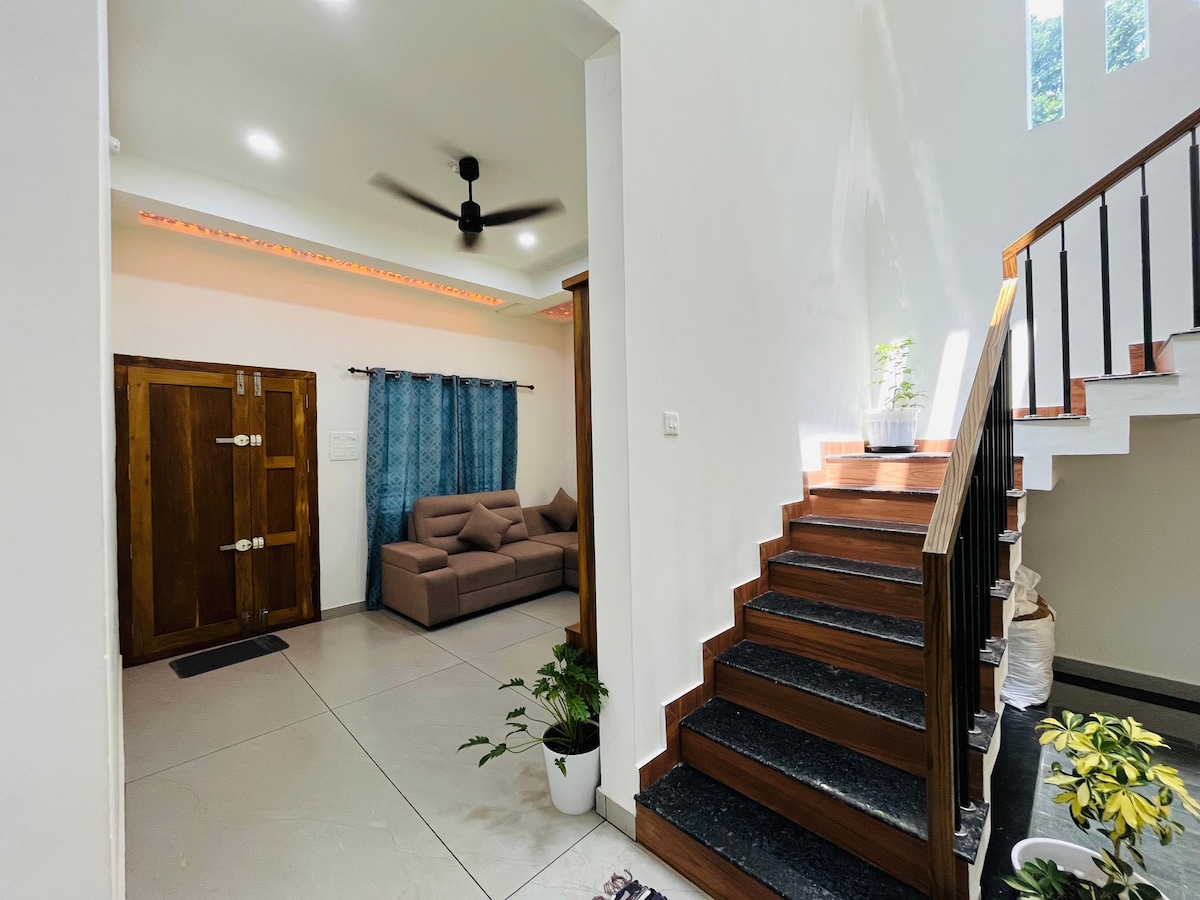 Pabėkite į gamtą nepakenkiant komfortui! Šiame jaukiame 3BHK name, esančiame po vaizdingomis Chamundi kalvomis, atsiveria vaizdas į mišką, privatus baseinas, biuro erdvė, pagal užsakymą suprojektuota pirtis ir 3 vonios. Mysore rūmai ir garsusis Mysuru zoologijos sodas yra vos už 4 km! Pradėkite rytą su gardžia Mysore masala doze netoliese esančiuose autentiškuose restoranuose. Puikiai tinka šeimoms, nuotoliniu būdu dirbantiems darbuotojams ar visiems, ieškantiems ramios kelionės su moderniais patogumais pačioje Mysuru žavesio širdyje.