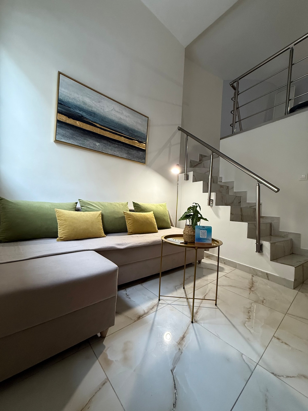 Šviesus ir jaukus 86 kv. m butas su centriniu šildymu, įsikūręs mažoje gatvėje vos už kelių metrų nuo centrinio eismo kelio su įvairiomis parduotuvėmis ir kavinėmis. Nors būstas yra nuošalus, jis yra labai arti miesto centro, apie 10-15 minučių pėsčiomis. Ideali vieta tyrinėti miestą pėsčiomis. Buto baldai yra minimalūs ir modernūs. Šviesos gausu, tačiau visi patogumai suteikiami, kad būtų užtikrintas privatumas. Virtuvėje yra visa įranga, užtikrinanti maitinimą visiems patiekalams.