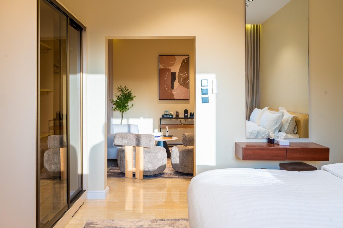 Patirkite prabangos viršūnę pačioje Rijado širdyje šiuose elegantiškuose 2 miegamųjų apartamentuose, kuriuose yra 3 prabangios lovos, dizainerių sukurtas interjeras ir nepamirštamas vaizdas į garsųjį Karalystės bokštą. - 🛌 Du erdvūs miegamieji su 3 aukštos klasės lovomis -🪟 Privatus balkonas su tiesioginiu vaizdu į Karalystės bokštą -🍷 Stilingas vidinis poilsio kambarys su dizainerių suprojektuotu baru ir sėdimomis vietomis - 🏊♂️ Bendras baseinas ant stogo