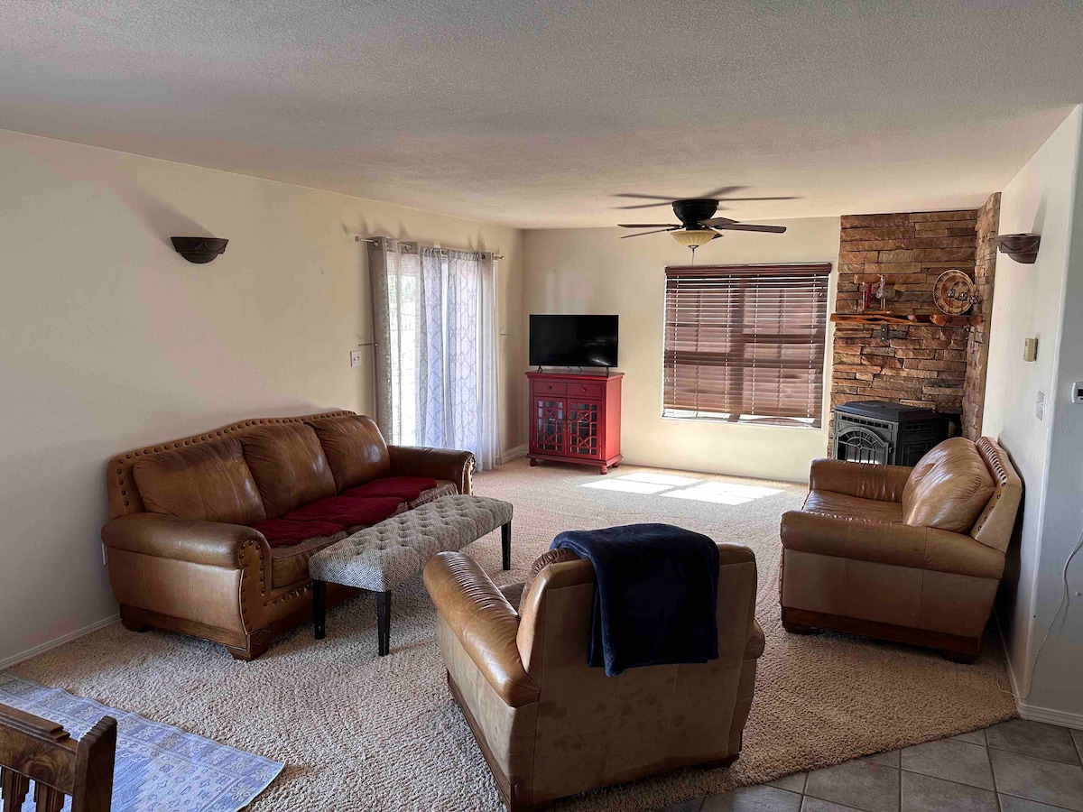 „Sveiki atvykę į šalaviją dykumoje! Mūsų namai su 3 miegamaisiais ir 2 vonios kambariais yra puiki vieta šeimoms, norinčioms pažinti žavingą Naujosios Meksikos valstiją. Mūsų jaukiuose namuose patogiai gali apsistoti iki 8 žmonių. Pasinerkite į regiono kultūrą ir grožį. Mėgaukitės erdvia svetaine, pilnai įrengta virtuve ir lauko valgomąja erdve. Patogiai įsikūręs netoli pėsčiųjų takų, istorinių vietų ir vietinių lankytinų vietų. Užsisakykite viešnagę dabar ir leiskitės į atradimų kelionę žavesio žemėje!“