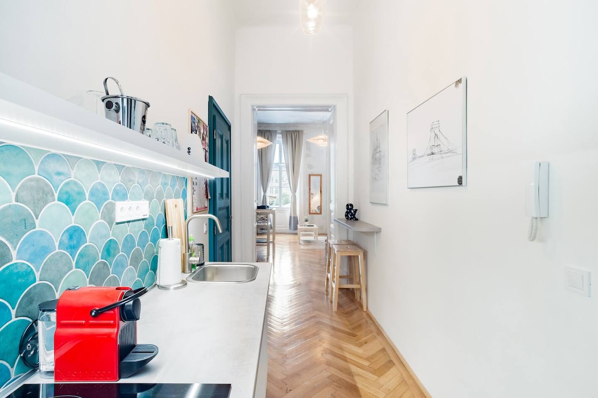 Šiuolaikinis dviejų kambarių butas Budapešto širdyje