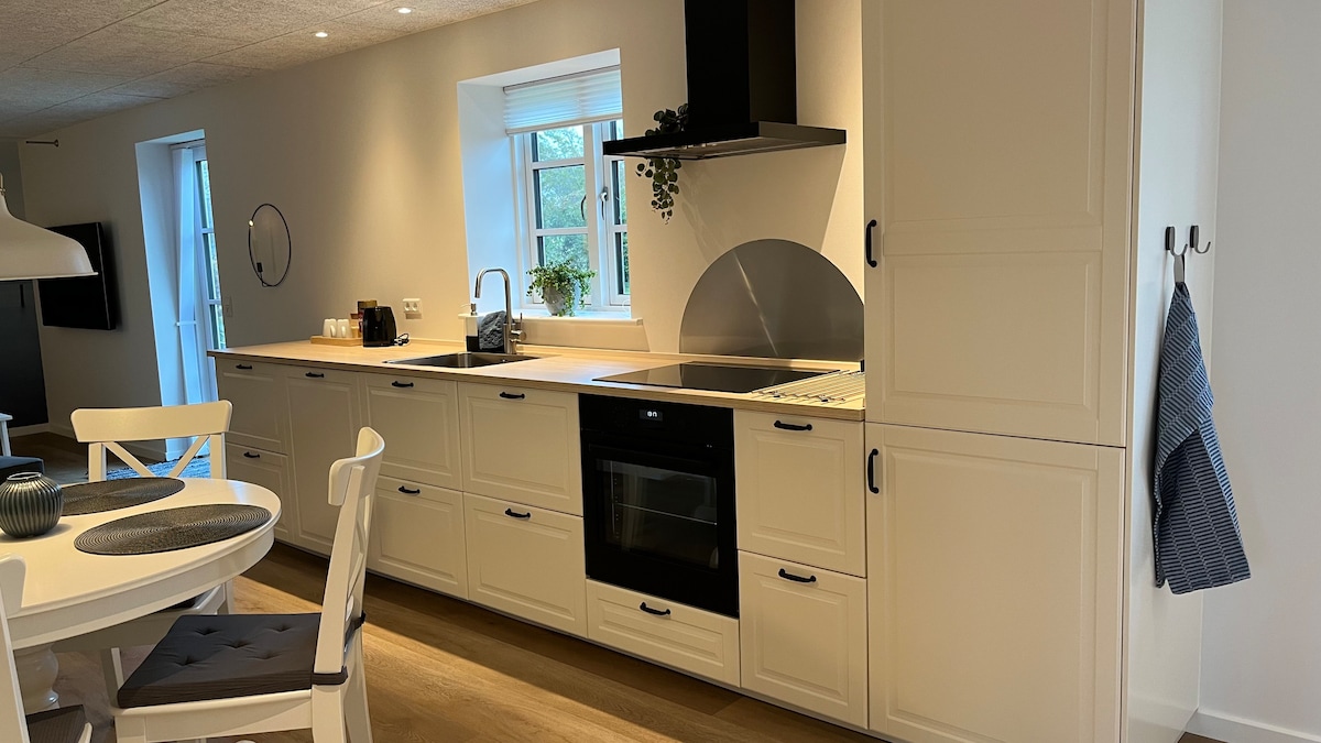 Mūsų priedą sudaro miegamasis su virtuvėle ir vonios kambarys su soda. Yra dvigulė lova, valgomasis ir virtuvė su šaldytuvu, elektriniu virduliu, skrudintuvu ir virykle. (Nėra kaitlentės) Nemokama kava/arbata. Šalia privačios plytelių terasos yra terasos durys su sodo baldais ir dujine kepsnine. Automobilį/dviračius galima pasistatyti automobilių stovėjimo aikštelėje. SuperBrugsen įsikūręs 100m ir net 400m. Apie 50 m nuo čia yra kino teatras ir netoliese yra keletas restoranų. Priedas yra greta žaliosios zonos.