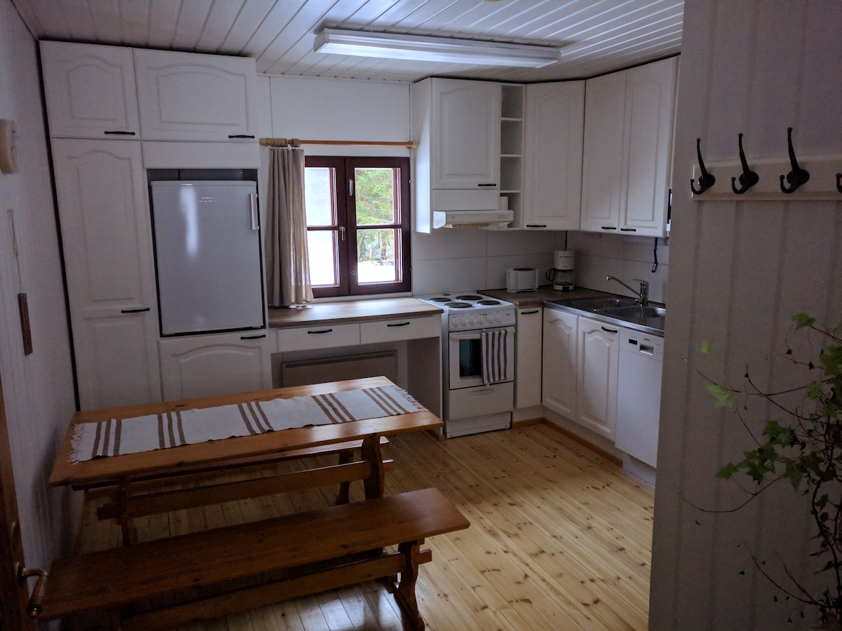 ‼️ Allergy cottage, no pets ‼️ (Due to our family member's severe allergy/asthma). Winter 2026: possibility use downhill skiing supplies, ask when booking. Longer vacation: (6 night) tickets for the spa included. A unique place on an island with a road. You will experience complete peace. Shower and toilet A great sauna experience Dishwasher, Washing machine, Tumble dryer, hair dryer, washing equipment, TV, micro, floorheating, aircondition, etc Cleaning 100€, bedlinen & towels 15€.