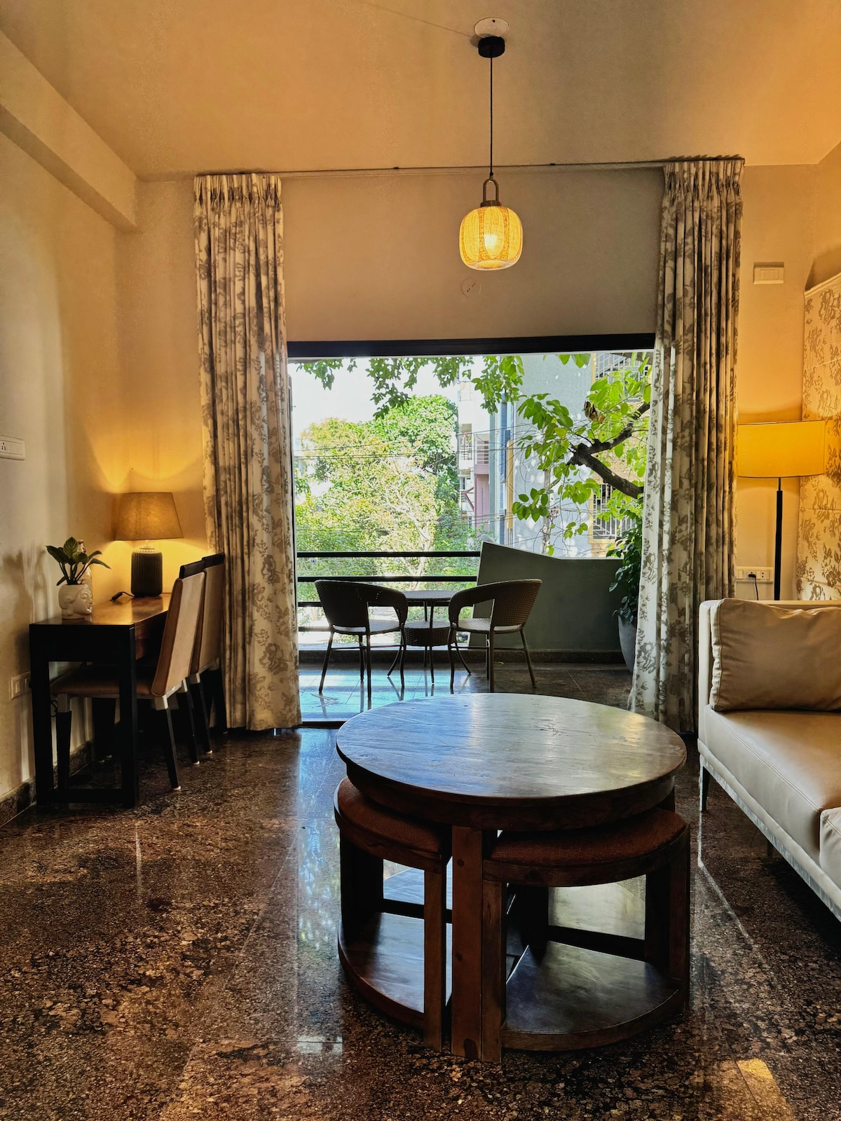 „Twilight Terrace“ yra stulbinanti triplekso vila Džajanagare, Bangalore, skirta prabangiai ir patogiai viešnagei. Šioje 3 BHK poilsiavietėje gali apsistoti iki 8 svečių, joje yra kelios erdvios salės, privatus teatras su aukščiausios klasės atlošais ir kvapą gniaužianti dvigulė terasa su sodu ir baru. Mėgaukitės panoraminiais panoraminiais vaizdais atsipalaiduodami stilingai, kad tai būtų puiki vieta apsistoti šeimoms ar grupėms, ieškančioms aukščiausios kokybės viešnagės.