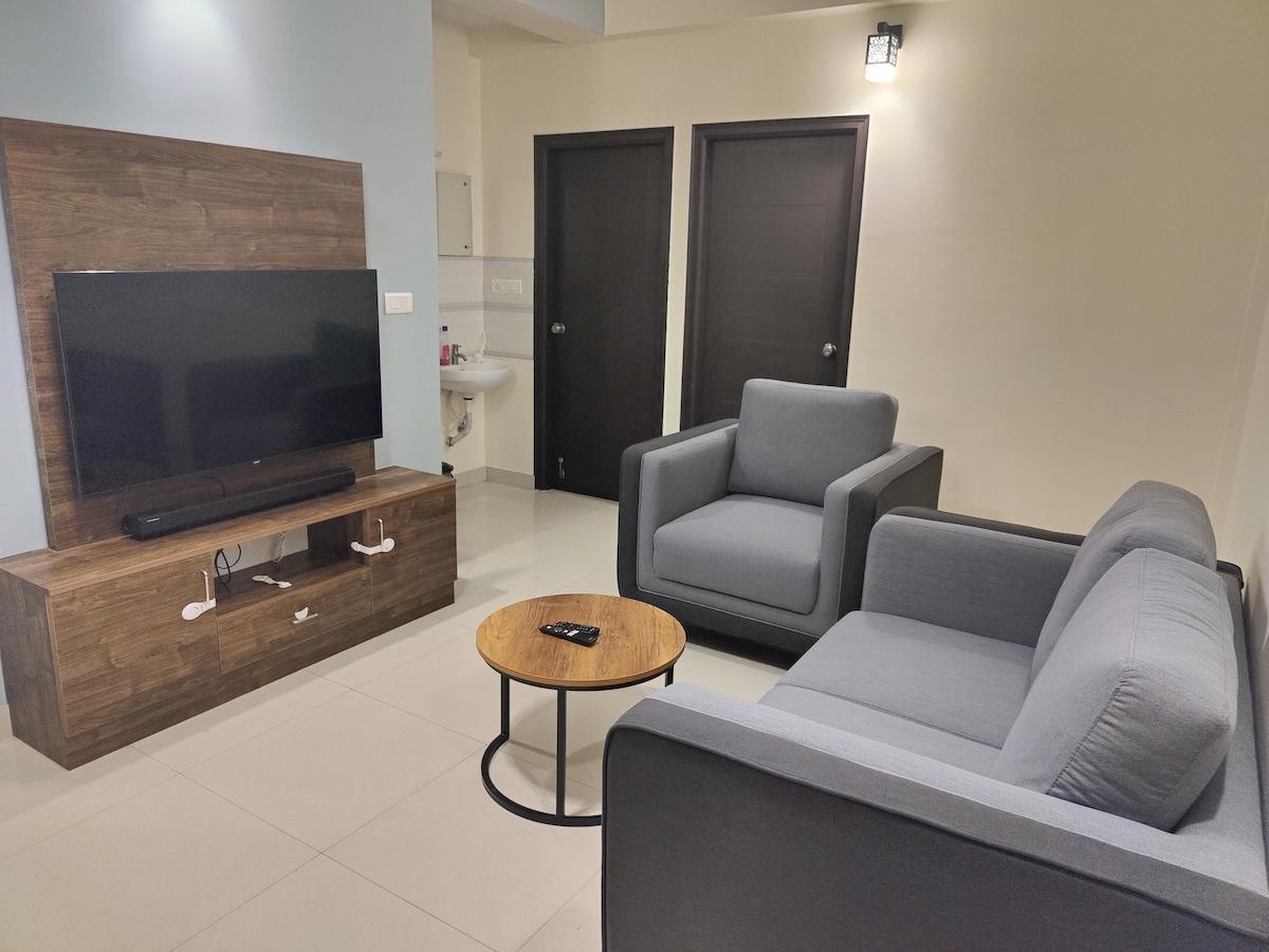 Sveiki atvykę į mūsų visiškai naują, erdvų 2-BHK butą, puikiai tinkantį šeimoms ir poroms, ieškančioms komforto ir patogumo. Miegamuosiuose yra karališko dydžio lovos su ortopediniais čiužiniais ir oro kondicionieriumi, kad galėtumėte ramiai miegoti. Atsipalaiduokite didelėje svetainėje su 43 colių išmaniuoju televizoriumi, žaibišku belaidžiu internetu ir specialia valgomojo zona. Yra du itin švarūs vonios kambariai su vonios reikmenimis. Pilnai įrengtoje virtuvėje yra aukštos kokybės prietaisai ir indai jūsų kulinariniams nuotykiams.