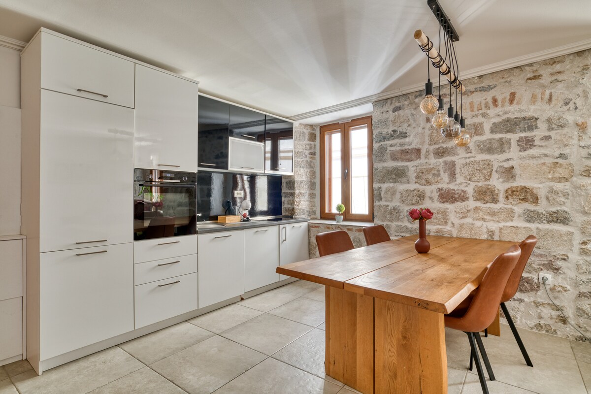 Ženkite į mūsų šviesią ir elegantišką 1 miegamojo šventovę, įsikūrusią viduramžių akmeninėse Kotoro senamiesčio sienose. Pasinerkite į UNESCO saugomą žavesį ir mėgaukitės šiuolaikiniu komfortu. Iš šio saulės spindulių papuošto buto atsiveria vaizdas į vaizdingą ir gyvybingą Pieno aikštę ir senovines miesto panoramas, kviečiančias keliauti laiku. Įsikūręs centre, vos už kelių akimirkų kelio nuo autobusų stoties, paplūdimių ir restoranų, jis siūlo gyvybingą ir atmosferišką poilsį pačioje istorijos širdyje.