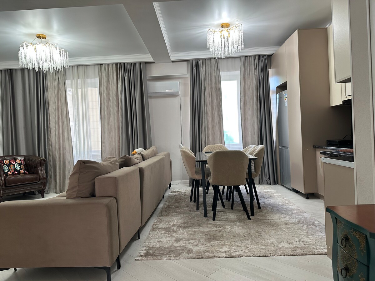 Stilingas būstas prestižiniame naujų pastatų rajone, adresu Kuttubayeva g. 15 B, Biškekas. Čia rasite erdvią, atviro išplanavimo erdvę su vaizdu į kalnus – Kirgizijos kalnyną (arba Kirgizijos Ala-Too) – ir jaukų atskirą miegamąjį. Jūsų patogumui: 2 oro kondicionieriai ir „šefo“ virtuvė (daug indų, taurių ir keptuvių visoms jūsų kulinarinėms idėjoms įgyvendinti). Vieta: vos už kelių minučių kelio pėsčiomis yra geriausi restoranai, barai ir vietinės parduotuvės. Puikus susisiekimas su visomis miesto dalimis. Tobula miesto energijos ir kalnų ramybės pusiausvyra. Ateikite ir mėgaukitės!