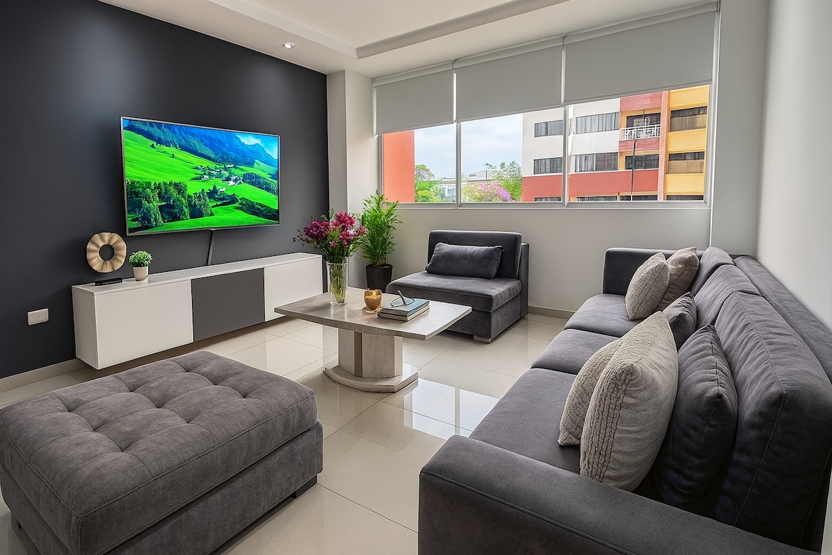 Modernus minimalistinio stiliaus butas Samborondón, įsikūręs privilegijuotoje vietoje su 24/7 privačia apsauga. Puikiai tinka šeimoms ar vadovams, ieškantiems komforto ir ramybės. Priešais El Dorado prekybos centrą. Jame yra 3 miegamieji, kiekviename iš jų yra televizorius su „Netflix“ ir oro kondicionierius. Svetainėje yra 65 colių televizorius. Taip pat turite 100 Mbps spartųjį internetą, puikiai tinkantį patogiam darbui ir praktiškai bei atpalaiduojančiai viešnagei.