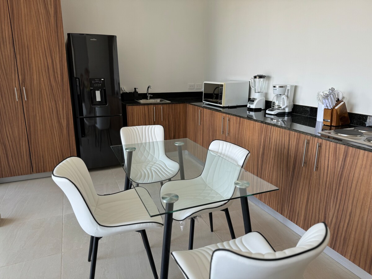 Sveiki atvykę į savo prieglobstį Temozón Norte - vienoje iš sparčiausiai augančių Meridos vietovių, kuri vis dar išlaiko savo ramybę ir natūralią aplinką. Mūsų vieno miegamojo butas puikiai tinka atsipalaiduoti ir mėgautis: jame yra karališko dydžio lova, spinta, privatus vonios kambarys ir patogi dvigulė sofa-lova svetainėje papildomiems svečiams. Mėgaukitės privačiu baseinu terasoje arba pasinaudokite pastato patogumais, pvz., sporto sale, bendru baseinu, augintinių parku ir renginių kambariu.