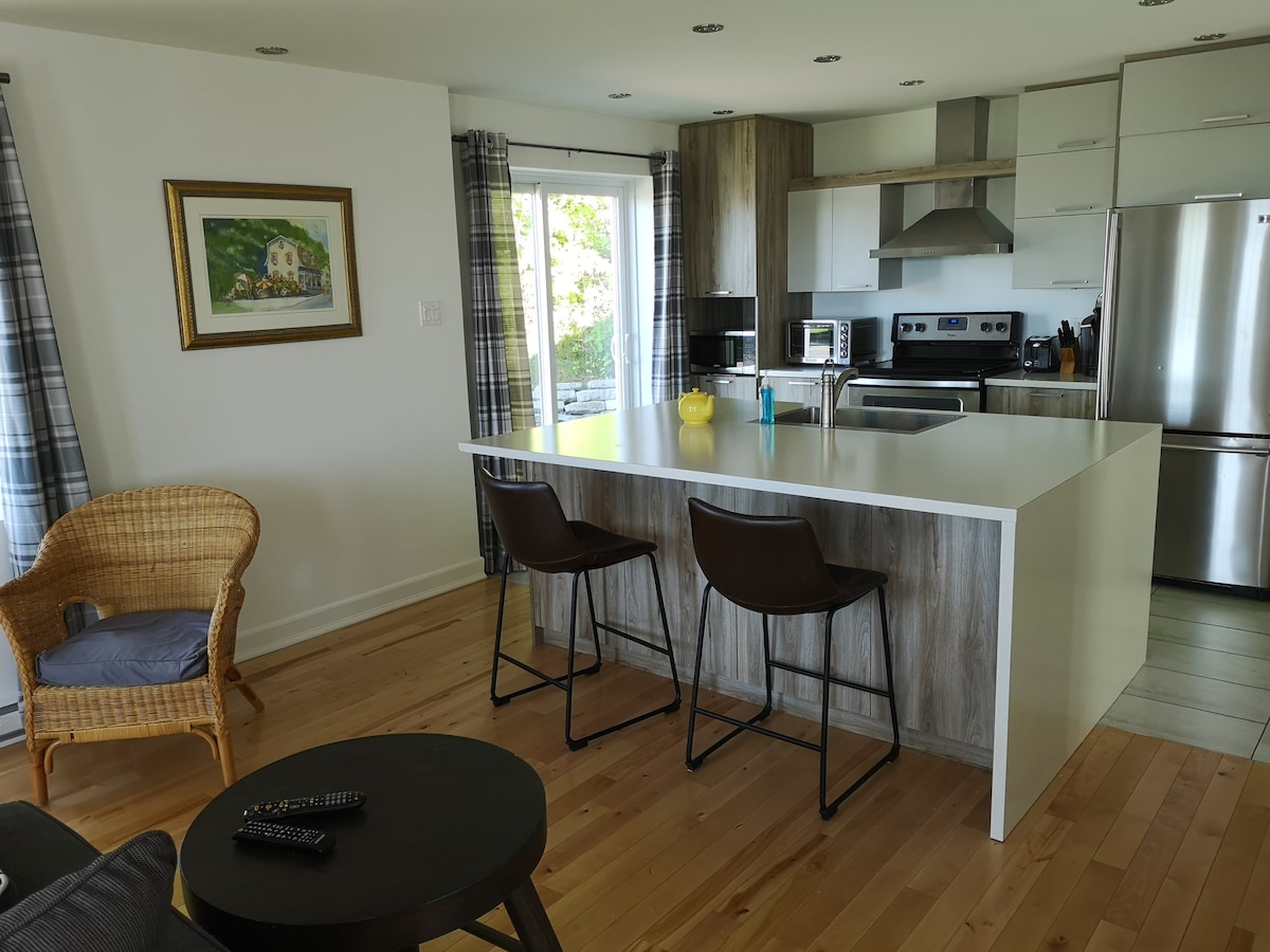 Įsikūręs pačioje Saint-Jean kaimo širdyje, šis dvivietis namas yra tiesiai prie upės. Mėgaukitės šio namo žavesiu ir mėgaukitės mielomis akimirkomis. Čia jūs pailsėsite! Gurkšnokite kavą, pasinaudokite prieiga prie streiko pasivaikščioti ir pasigrožėti kraštovaizdžiu, kurį jums siūlo St. Lawrence upė. Jei norite, eikite po salą, pasiimkite vakarienę ir paragaukite šių vietinių saldainių stebėdami saulėlydį.