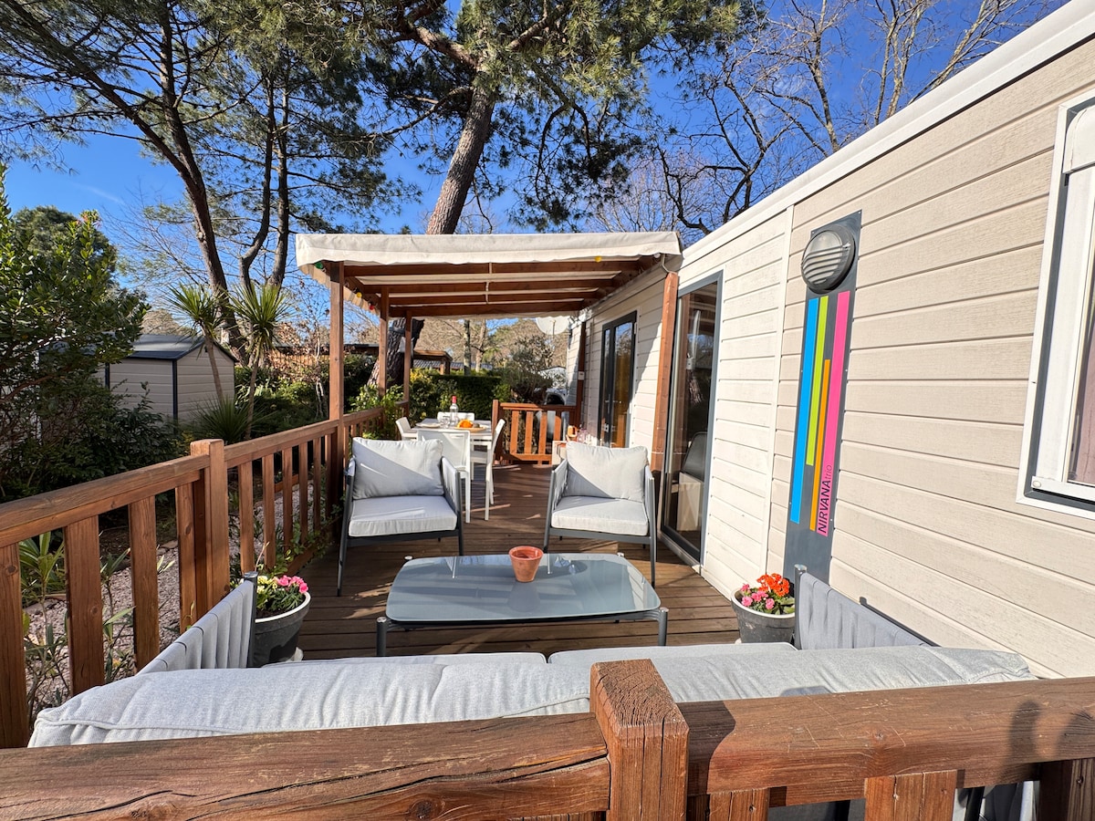 * Ideali šeima, šešėliuotas/aptvertas sklypas, nemokamas Wi-Fi * Poilsio namelis 35 m2 + dengta ir uždara 10 m2 terasa (galimybė visiškai atsidaryti esant geram orui), žema terasa 22 m2 su deginimusi/Čilės * Baseinas su čiuožyklomis (gegužės-rugsėjo mėn.) * 4 žvaigždučių gyvenamasis laisvalaikio parkas, pačioje miško širdyje, daug veiklos: tenisas, vaikų parkas, miesto stadionas, vaikų žaidimų aikštelės, restoranas-baras ir maisto prekių parduotuvė... * 15 minučių nuo Pyla kopos, Arcachon, Aqualand, zoologijos sodo, vandenyno paplūdimių...