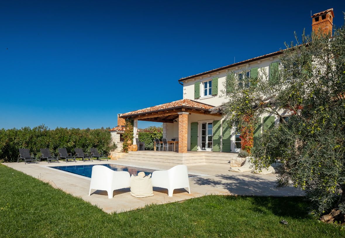 Villa GreenBlue yra modernus ir prabangiai įrengtas atostogų namas su baseinu, esančiu ramioje vietoje, vos už 2 km nuo Porec centro ir lygiai taip pat nuo jūros. Namas yra nuošalus, apsuptas pievos ir miško, iš kurio smalsūs gyventojai, stirnos ir laukiniai triušiai dažnai „užsuka“ prie pievos. Namas yra aptvertame sode, kuriuo gali naudotis tik namo svečiai su dideliu 50 m2 baseinu, lauko sūkurine vonia, suomiška pirtimi ir kepsnine.