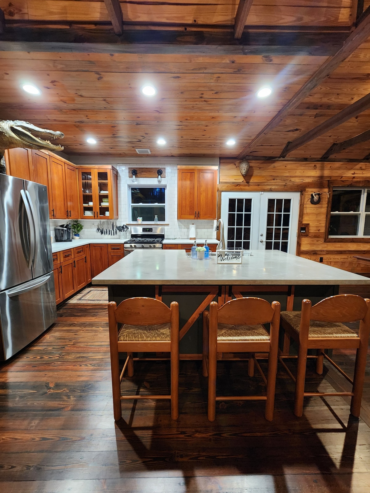 Nestled in Branford, FL, along the scenic Suwannee River in Hatch Bend, this pet friendly, three-bedroom, three-bath lodge is perfect for weekends or extended stays. Upstairs features two king bedrooms with ensuite baths, a cozy living area with a gas fireplace, and a fully equipped modern kitchen. Downstairs offers a king bedroom, full bath, kitchenette, and living space. An enclosed elevator makes transporting gear easy. Experience comfort, charm, and Suwannee River beauty at our retreat!
