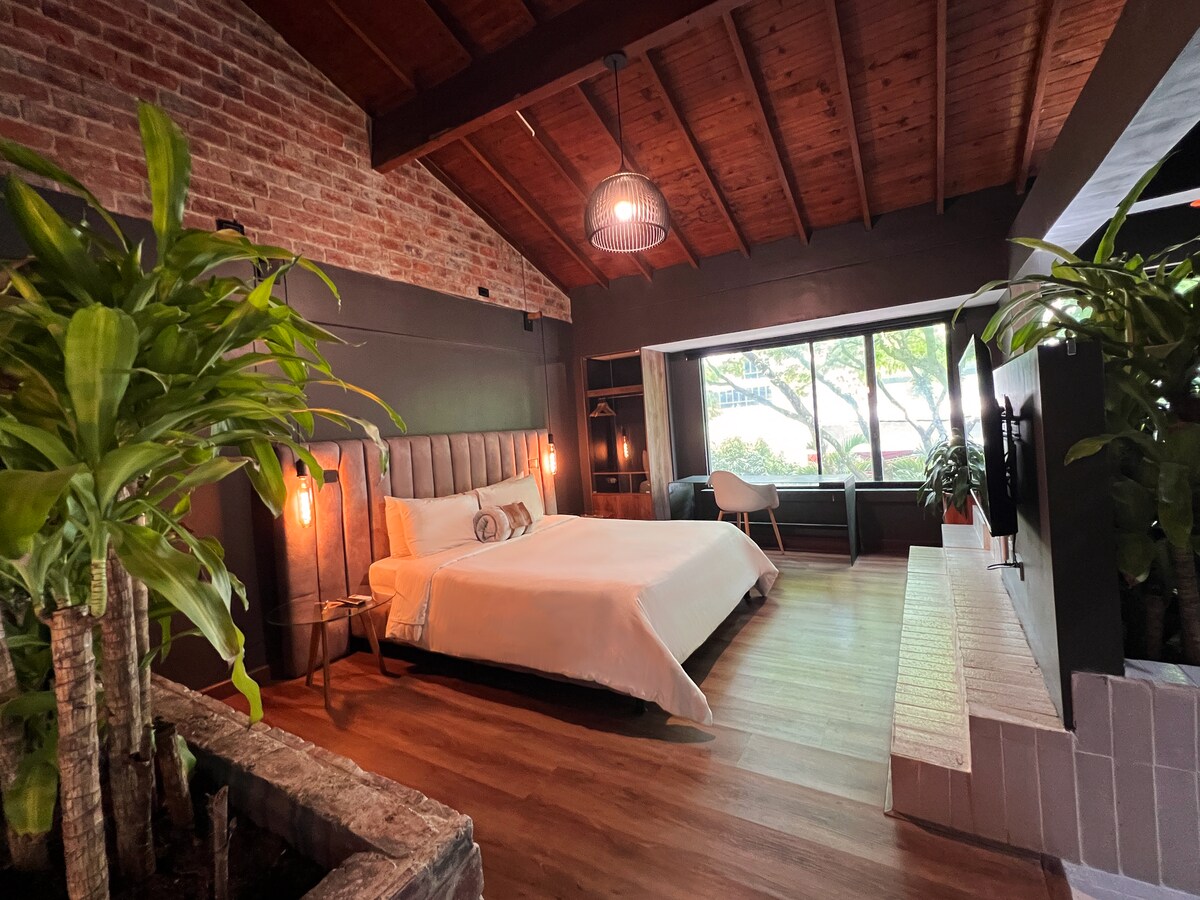 Experience Medellín in this stylish and exclusive open-plan studio near Parque Lleras with private jacuzzi, A/C, king-sized bed, 54" rotating smart TV, Netflix, workspace with high-speed Wi-Fi, fully equipped kitchen, washer/dryer, tea/coffee station, and black-out curtains. Enjoy amazing city views, superb interior design and finishes, gym, sauna, swimming pool, and on-site bars, restaurants, cafeteria, and art gallery — the ultimate exclusive retreat for comfort, style, and vibrant nightlife.