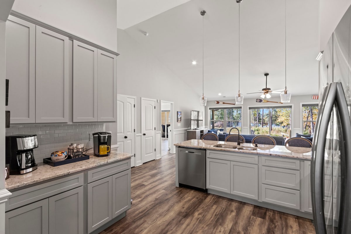 1400 kv. pėdų žemesnio lygio blokas. Erdvėje yra du miegamieji ir du pilni vonios kambariai, didelė svetainė ir mažesnė antroji svetainė su 2 sofomis-lovomis. Dideli langai ir dvigubos durys veda į gražią atvirą lauko erdvę. Moderni virtuvė ir valgomoji zona, puikiai tinkanti maloniam maistui ir gražiam vaizdui. Taip pat turime 3 asmenų infraraudonųjų spindulių pirtį su vaizdu į ežerą, Bluetooth ir šviesos terapija. Taip pat galite mėgautis mūsų doku su giliais vandenimis ir puikiais vaizdais. Tikimės, kad jūsų atostogos bus malonios ir atpalaiduojančios