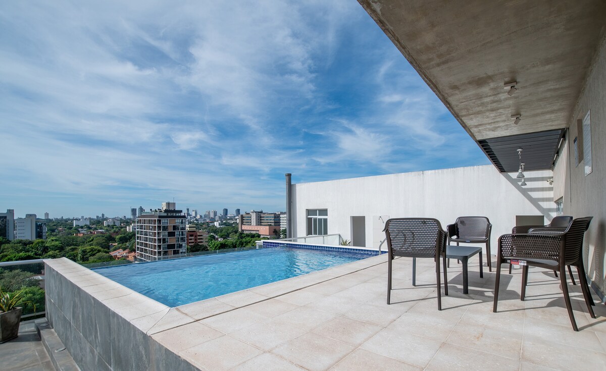 Gražus jaukus kondominiumas, paruoštas, kad galėtumėte mėgautis viešnage Asunsjone kelioms dienoms arba keliems mėnesiams. Įtraukta viskas, ko jums reikia. Netoliese yra „Shopping Villa Morra“/„Mariscal“, prekybos centras ir daugelis restoranų. Naudojamas stogo baseinas, kepsninė ir sporto salė. Didelis balkonas su puikiu vaizdu. Wi-Fi, patalynė, virtuvė ir viskas, kad jaustumėtės kaip namie.