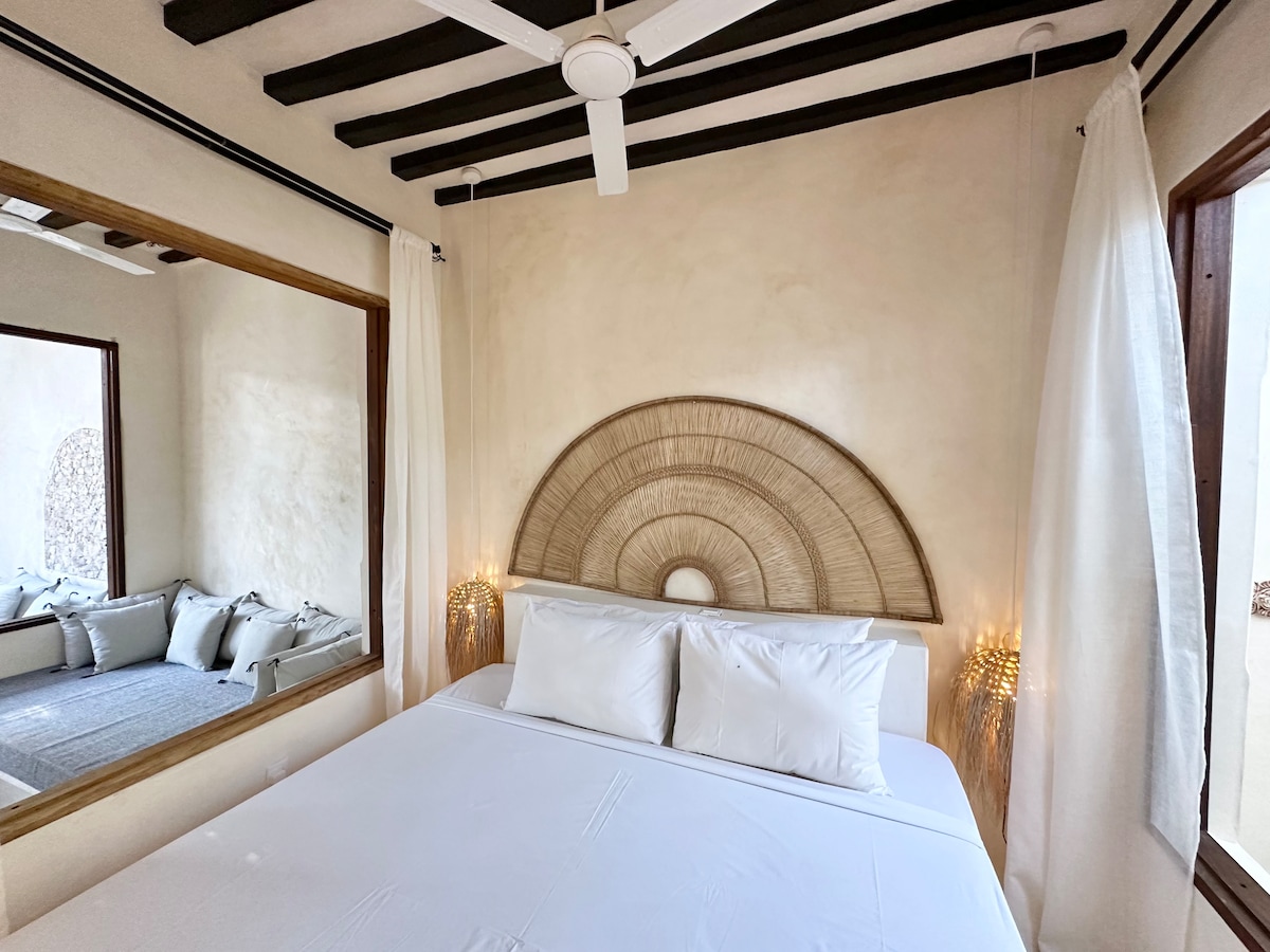 Relax in this charming 1-bedroom apartment in the heart of Shela, Lamu. Enjoy an open kitchen and dining area that flows onto a private terrace (Baraza) — perfect for unwinding after a day at the beach. It has access to Makuti rooftop terrace with benches and cozy swing bed. Simple, airy, and authentic Swahili style for a peaceful stay.