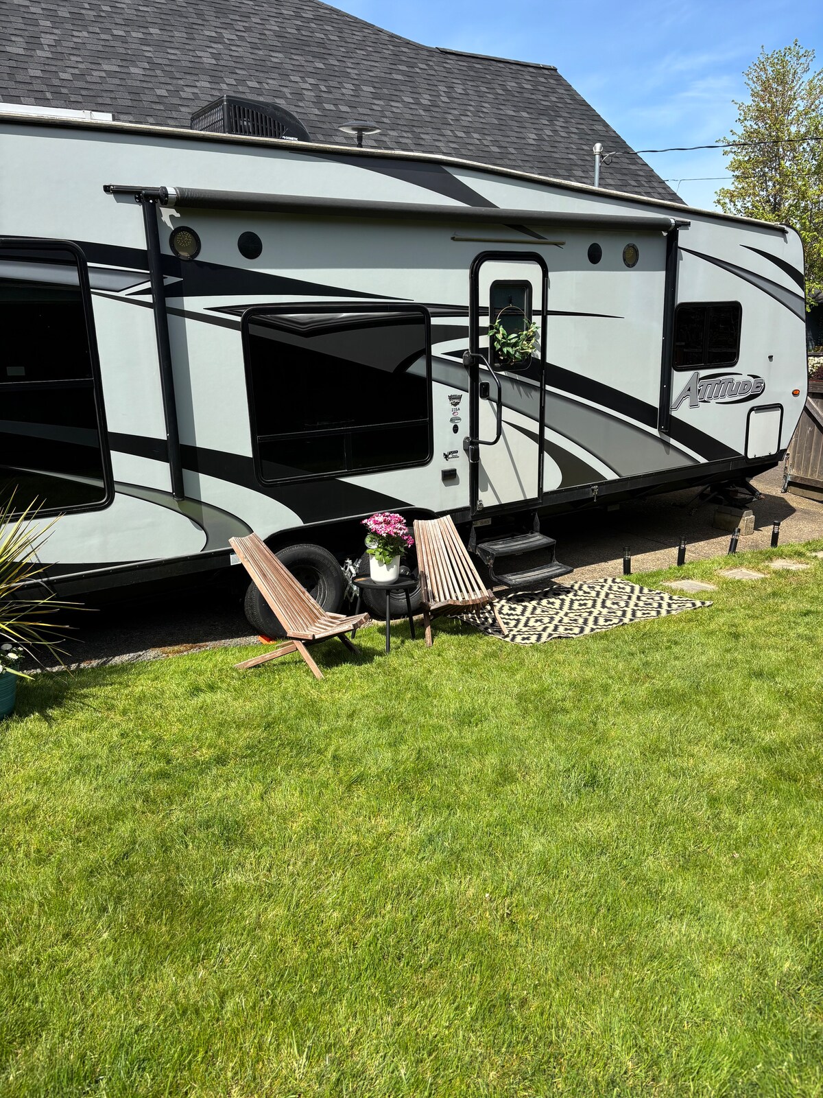 🏡 Privatus automobilinis namelis 7 akrų plote – 2 miegamieji, netoli oro uosto ir Ančių žaidimų! ✈️🦆 Sveiki atvykę į mūsų ramią RV poilsiavietę privačioje nuosavybėje Eugene! 🌼 Mūsų erdviame 44pėdų žaisliniame vežimėlyje yra du privatūs miegamieji🛏️, atnaujinta patalynė, jaukus gyvenimas, kavos stotelė ☕️ su puodeliais ir grietinėle, patogios lauko sėdimosios vietos, nauja 🍔kepsninė ir sezoninė laužavietė🔥. 5 minutės nuo oro uosto ir netoli UO🎓,Hayward Field ir miesto centro. Vestuvių vieta ir Orchard Point ežeras. Galima naudotis „Uber“ ir „Lyft“!