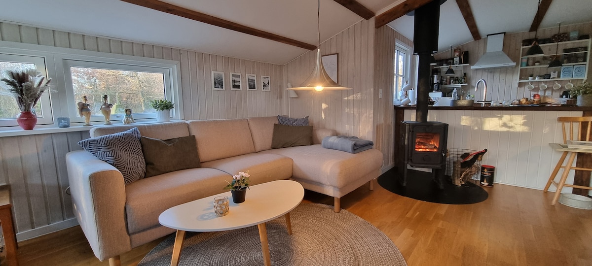 Modern, practical, romantic and comfortable cottage in lovely beach location on the island of Thurø with electric car charger point (Type 2 with 16A 11 kW), full outdoor deck, green lawn, free unlimited parking, split air-conditioning unit for convenient heating / cooling, Wi-Fi, full kitchen, wood stove, shower bathroom, tumble dryer and washer. Thurø has easy road access to Svendborg.