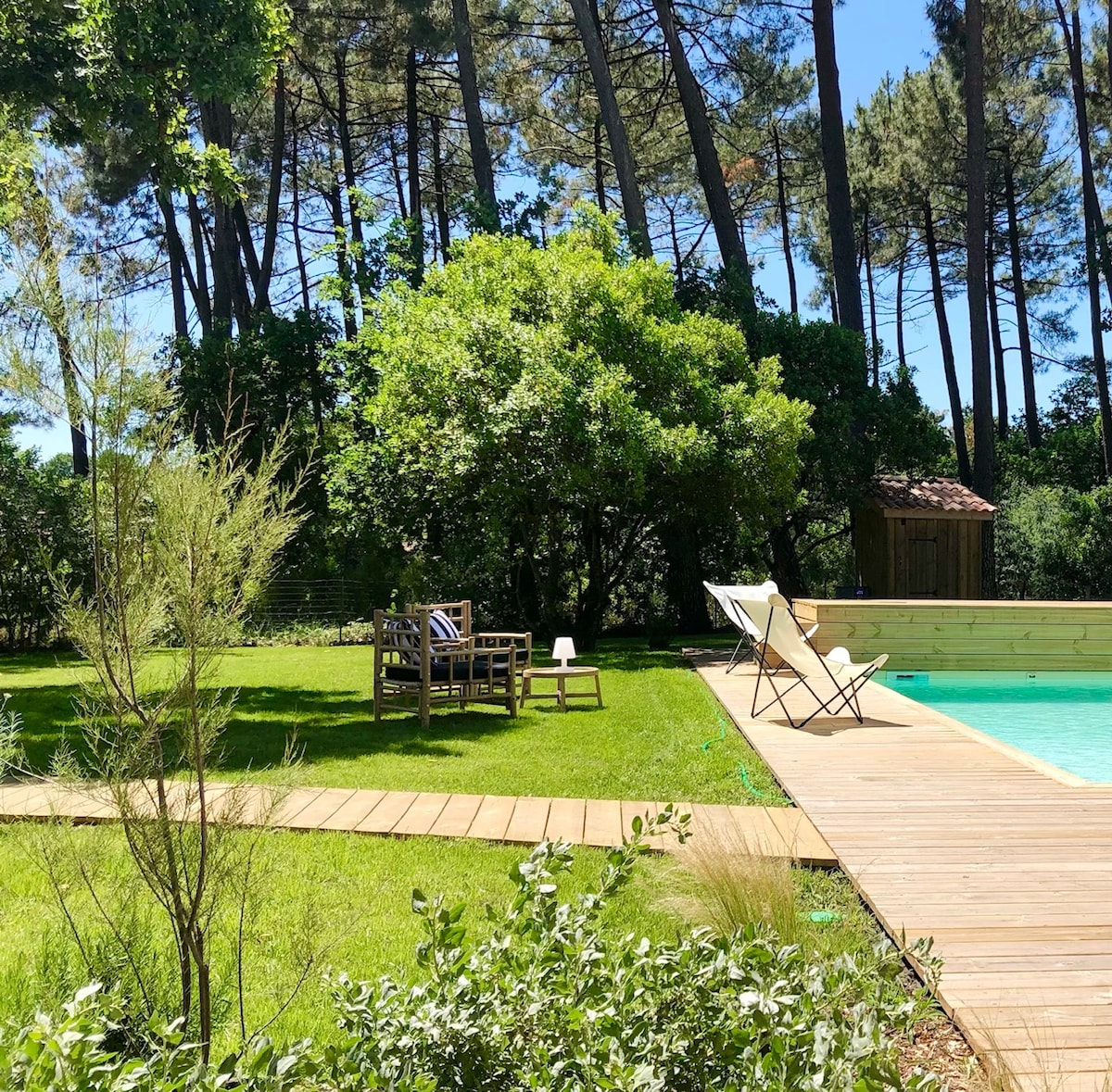 Prabangi vila Lège-Cap Ferret 10 žmonių su 4 miegamaisiais, 3 vonios kambariais, privačiu baseinu, vasaros virtuve, terasa ir miškingu sodu. Komfortas, elegancija ir ramybė , dviračių takai, netoliese esantys paplūdimiai,parduotuvės ir restoranai. Puikiai tinka šeimos atostogoms. Patalynė, valymas, Wi-Fi ir automobilių stovėjimo aikštelė įskaičiuota nerūpestingai viešnagei.