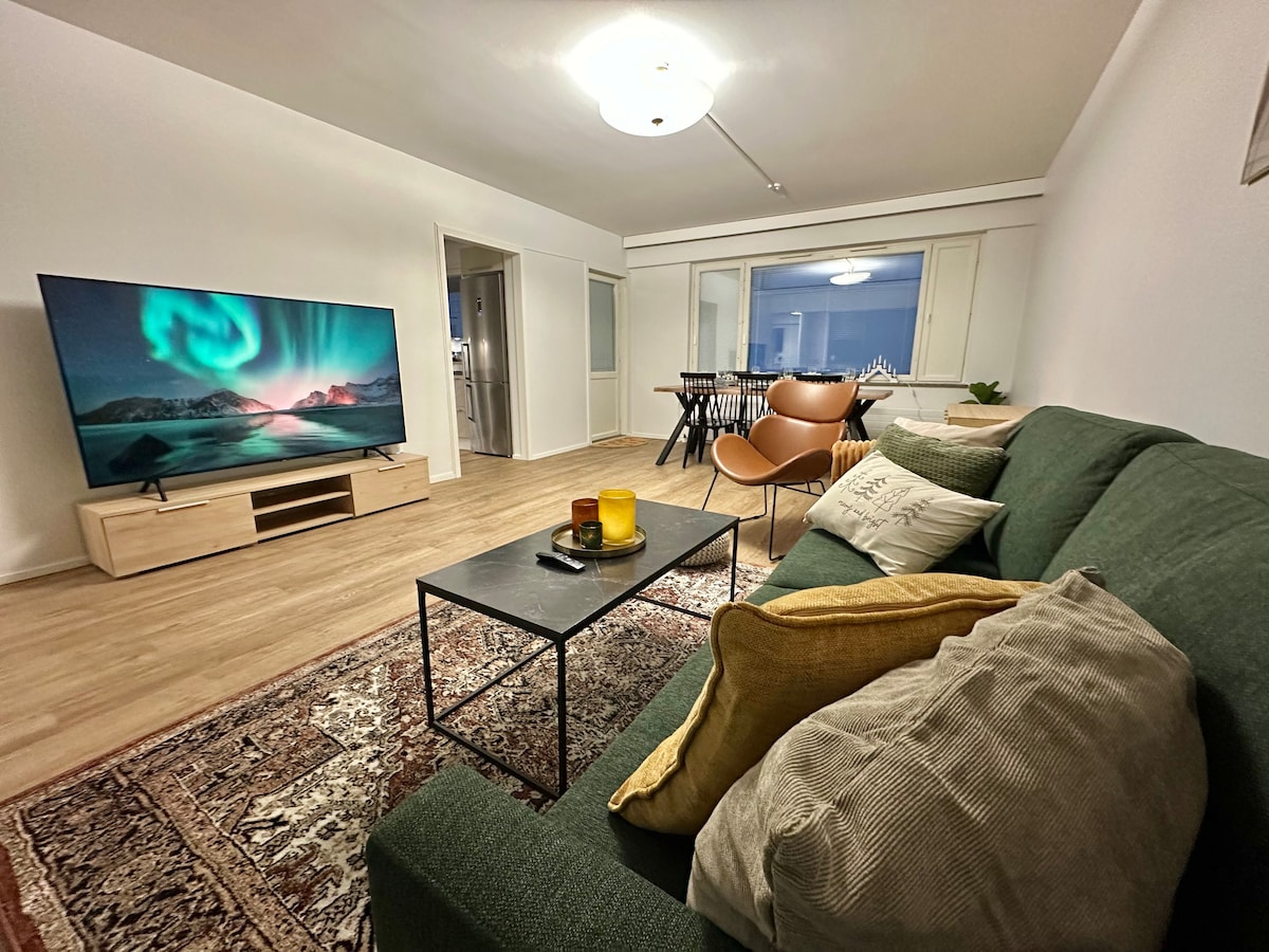 Sveiki atvykę pasimėgauti atostogomis Rovaniemyje ir būti mūsų svečiu. Jaukus 50 kv. m butas šeimos namelyje prie upės: virtuvė, svetainė su miegamuoju loftu, vonios kambarys, balkonas, požeminė pirtis ir sūkurinė vonia (už papildomą kainą), kepsninė ir vieta automobiliui. Yra keturios lovos (viena dvigulė ir dvi viengulės lovos) ir, jei reikia, kūdikio lovelė. Butas yra ramioje šeimos name, už 5 min. kelio automobiliu ir 20 min. pėsčiomis iki miesto centro. Prekybos centras taip pat yra labai arti (2 min. kelio automobiliu ir 10 min. pėsčiomis).