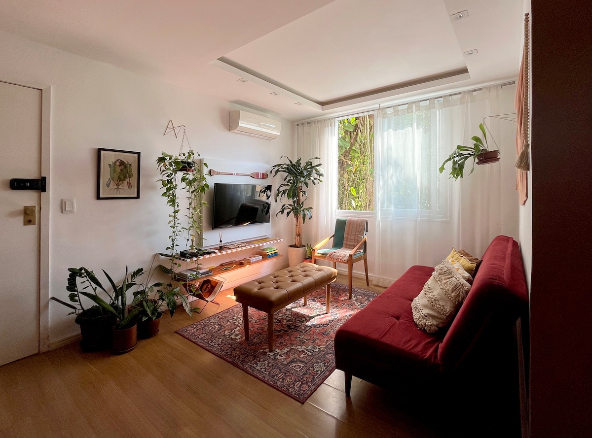 Apartamento térreo, bem iluminado, com boa ventilação e com linda vista para a cidade do Rio de Janeiro. Decoração aconchegante, com plantas. Localizado no bucólico bairro de Santa Tereza, em rua tranquila, segura em meio à natureza, com muito verde e próximo aos museus Chácara do Céu e Parque das ruínas, ao lado da estação do Bondinho de Santa Tereza. A 5 minutos andando do centro comercial do bairro, com fácil acesso ao Centro da Cidade e aos bairros da Glória e Catete.
