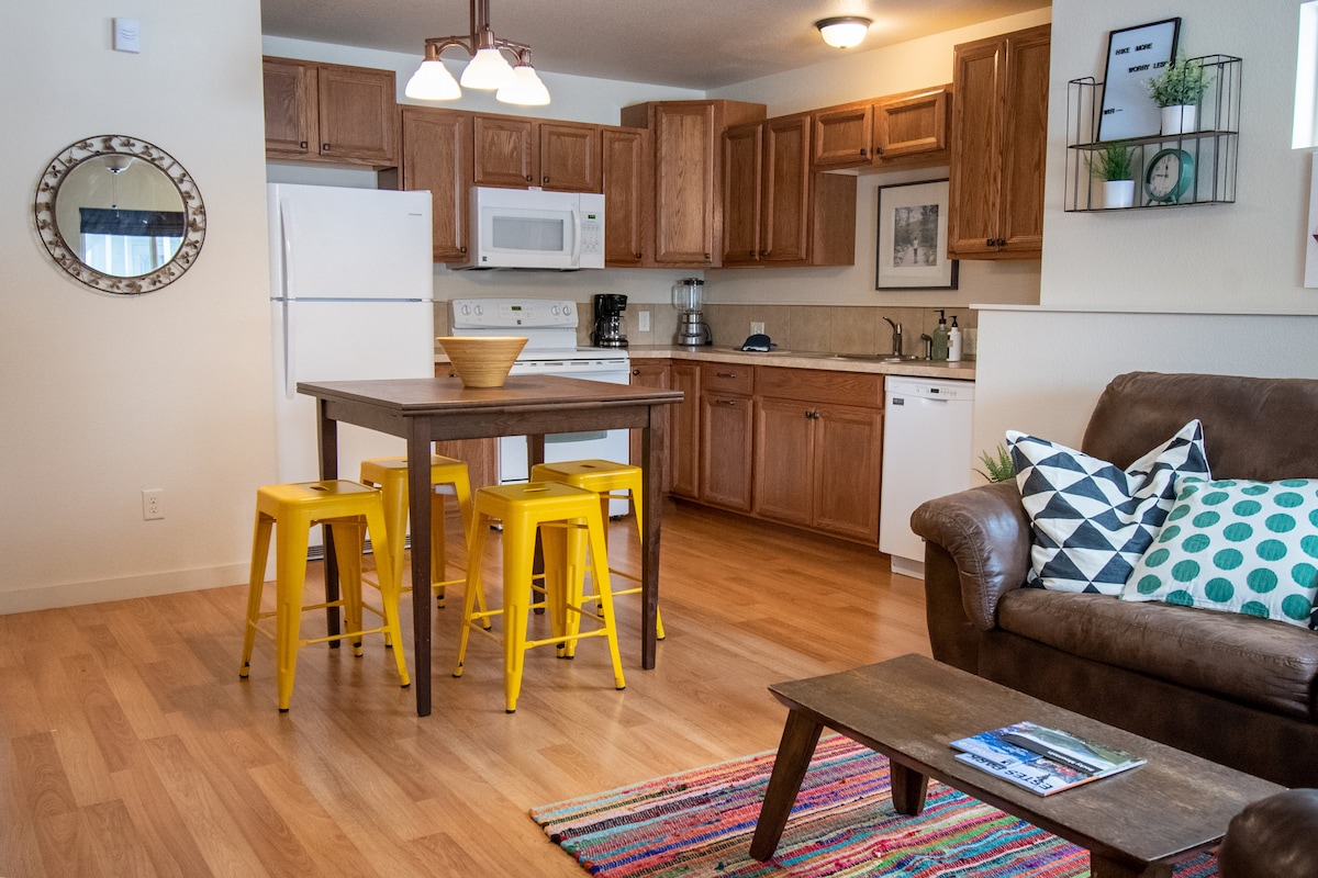 Šis žavingas ir jaukus šalia upės esantis kondominiumas, įsikūręs kvapą gniaužiančiame uolos fone pačioje miesto centre, siūlo lengvą prieigą prie parduotuvių, restoranų, nuostabių vaizdų ir vos už kelių minučių kelio automobiliu iki parko. Nėra neįprasta, kad mūsų svečiai pabunda briedžių bandoms vos už kelių pėdų nuo lauko durų! Peržiūrėkite kitą panašų skelbimą, esantį šalia, 9 ir 10 blokų! Galbūt rasite kitų laisvų datų, o gal net konkurencingesnę kainą! airbnb.com/h/thelofts9 airbnb.com/h/thelofts10