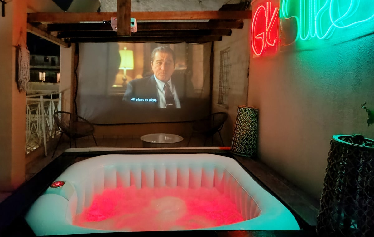 Ypatinga viešnagė su neribotu vaizdu į aikštę. Didelėje 100 kv. m terasoje atsipalaiduosite mėgaudamiesi šildoma sūkurine vonia, 150'' milžinišku kino potyrių ekranu, kepsnine ir šešių asmenų valgomuoju su vaizdu į Ag. Konstantinou. Jame yra svetainė su sofa-lova ir atskiras miegamasis, jame gali apsistoti iki 4 asmenų. 2 40 colių išmanieji televizoriai su „Netflix“/„YouTube“. Ketvirtame aukšte (liftas pasiekia trečią aukštą ir reikia pakilti vienu aukštu)