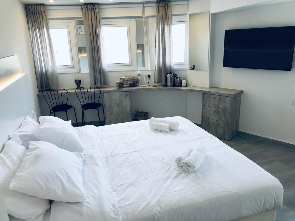 Butikinis viešbučio kambarys Larnakos miesto centre, įskaitant nemokamą Wi-Fi, nemokamą švedišką pusryčių stalą, nemokamą prieigą prie sporto salės 24/7, nemokamą privačią automobilių stovėjimo aikštelę, visą parą veikiančią registratūrą ir kasdienį namų tvarkymą. Papildomos paslaugos: pervežimas iš ir į oro uostą, konferencijų salė, verslo centras, poilsio baras, kambarių aptarnavimas ir baseino stalas. Viešbučio bendro naudojimo erdvės yra unikalios/teminės, jose yra meninių elementų ir sienų dažytų įžymybių bei populiarių veikėjų, tokių kaip kino aktoriai, sportininkai, dainininkai ir dar daugiau!