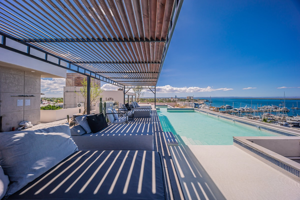 Relax with pool, jacuzzi and unique marina view
