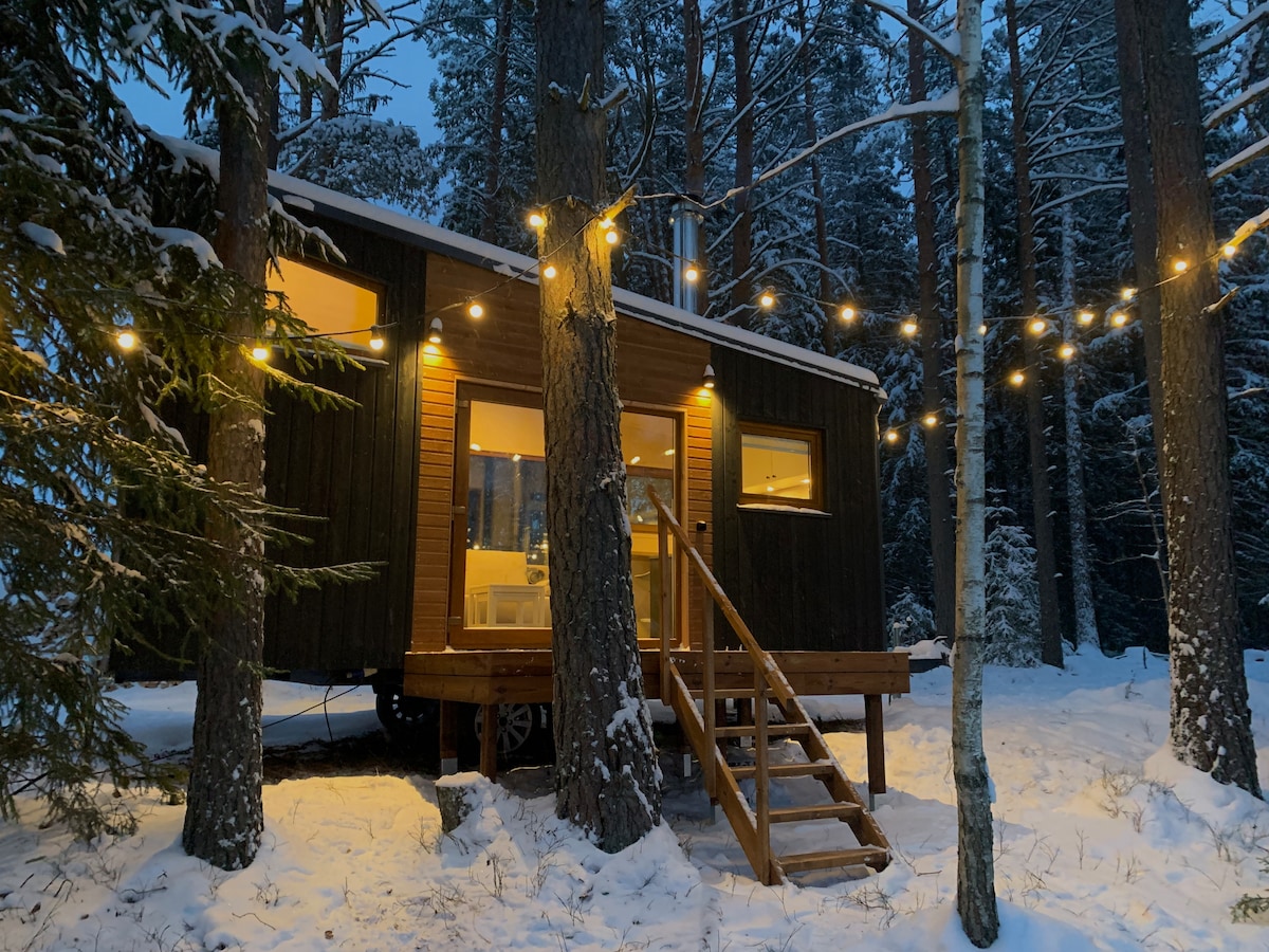 Šiame 2017 m. pastatytame privačiame 60 m2 žiemiškai nepriekaištingame mediniame name yra 1 miegamasis su dvigule lova ir didelė svetainė su atvira virtuve. Taip pat yra elektrinė pirtis ir terasa, kuri atsiveria į pievą, kuri natūraliai virinama į mišką. Daug natūralios šviesos, kintamosios srovės, šildomos grindys, pilnai įrengta virtuvė, pirtis ir 4G belaidis internetas - tai patogi ir atpalaiduojanti viešnagė visais metų laikais. Jūsų dispozicijoje yra 22 kW EV įkroviklis, maitinamas 100% atsinaujinančia elektros energija.