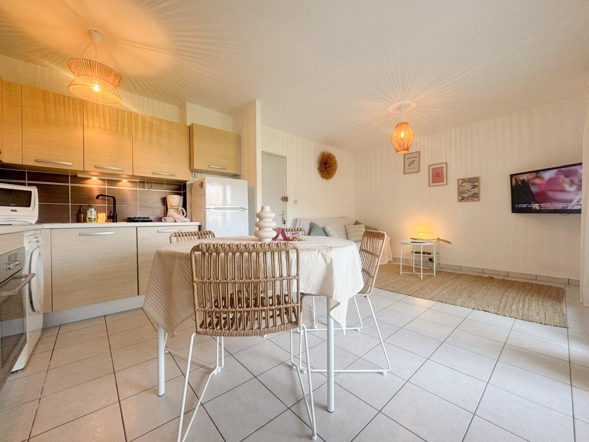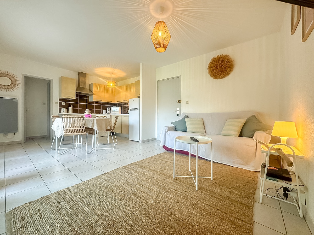 Butas T2, visiškai renovuotas , labai šviesus, su gražia terasa su vaizdu į jūrą, gyvenamasis būstas su baseinu 20 metrų pėsčiomis nuo jūros. - 1 atskiras miegamasis, patalynė, 140 cm lova, TV -SDB su vonia, rankšluosčiais -WC - įėjimas su spinta. - Pilnai įrengta virtuvė (mikrobangų krosnelė, Senséo kavos aparatas, šaldytuvas/šaldiklis, 4 degiklio viryklė, orkaitė, skrudintuvas, indaplovė, skalbimo mašina) - Svetainė, lova, greita sofa 140 cm, TV, WiFi - Terasa su vaizdu į jūrą ir kalnus su stalu ir kėdėmis.
