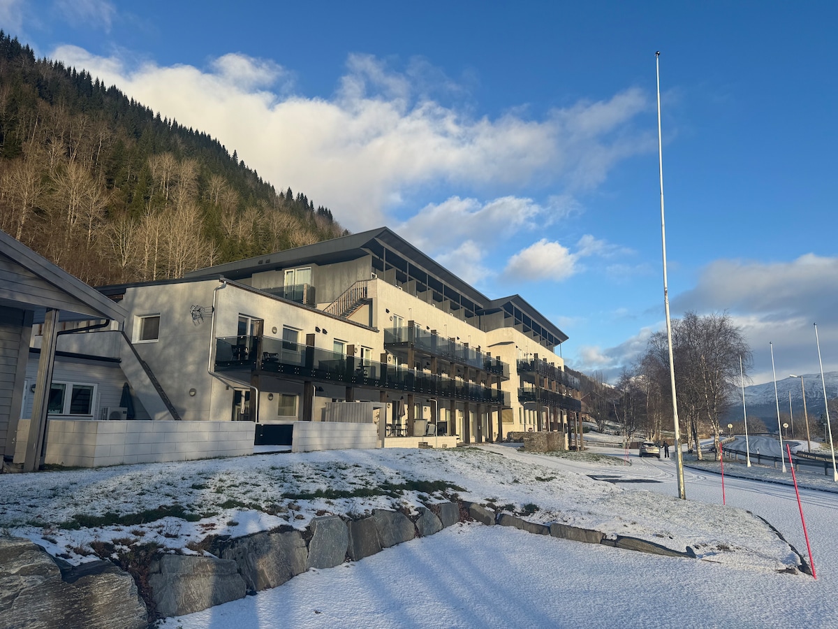Leilighet m utsikt og basseng. Fine snøforhold