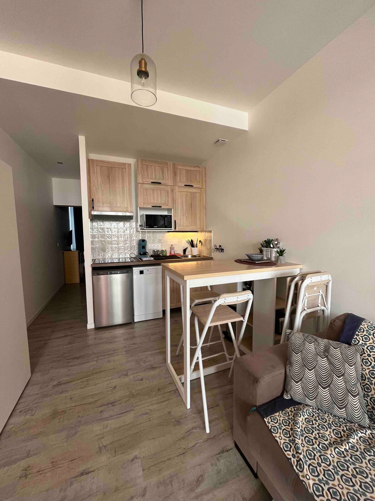 Žavinga 23 m² studija pirmame aukšte, visiškai renovuota, trumpas pėsčiomis iki jūros Labai šviesus dėl pietinės pusės, su vaizdu į jūrą, oro kondicionieriumi ir šviesolaidžiu Nauja greita sofa-lova (2025 m. kovas), siūlanti erdvią miegamąją ir puikų komfortą, artimą tikrai lovai, nes turi kietą 21 cm čiužinį Įskaičiuota privati automobilių stovėjimo aikštelė Puikiai tinka porai su vaiku ar paaugliu (ne daugiau kaip 3 suaugusieji). Yra rankšluosčiai ir patalynė ✨ Puikiai tinka atpalaiduojančiai viešnagei prie jūros