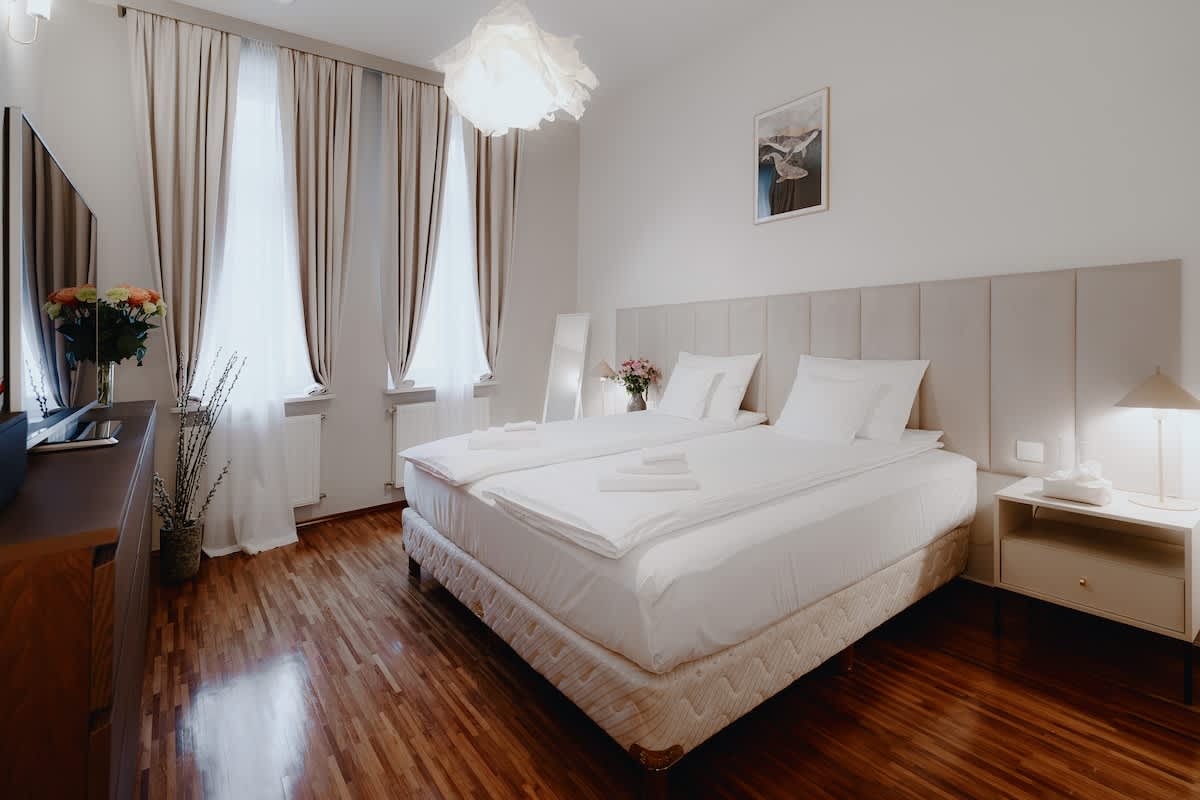 Erdvus butas (160 m2) su žaliu vidiniu kiemeliu miesto centre! Puikiai tinka draugų grupėms ar 2-3 kartu keliaujančioms šeimoms:) 3 miegamieji, didžiulė svetainė su muzikos rinkiniu, didelis daugiafunkcinis kambarys su veidrodžiais, sujungtais su sodu (10 papildomų lovų) 10 minučių automobiliu, tramvajumi arba autobusu nuo pagrindinės turgaus aikštės; Nemokama automobilių stovėjimo aikštelė Privatus transportas iki centro ir atgal pagal pageidavimą TRANSPORTAS IŠ ORO UOSTO UŽ PAPILDOMĄ MOKESTĮ