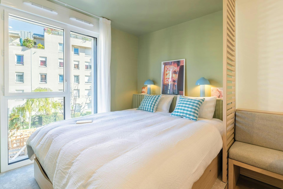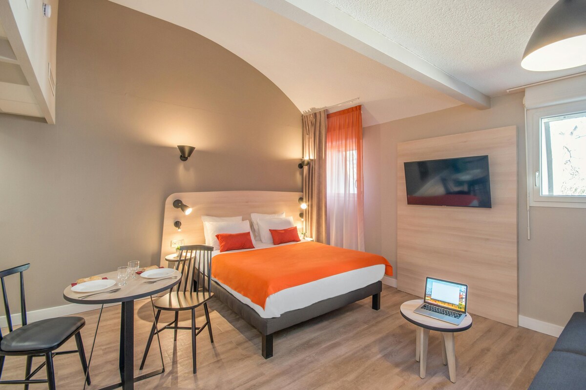 Our modern double studios feature a double or single bed (depending on the layout), air conditioning, soundproof windows, blackout curtains, an LCD TV, a work area with wifi, and a safe. For your comfort, the bathroom includes a towel warmer and a hairdryer. The kitchenette makes your stay even more convenient. Additional amenities include a private bathroom with bathtub, non-smoking rooms, and wireless internet access.