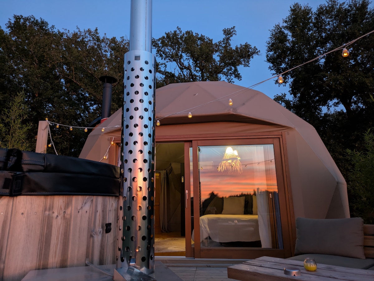 Dormir sous les étoiles au coeur des chênes... Offrez-vous une nuit insolite dans notre dôme géodésique éco-construit sur pilotis. Véritable cocon immersif, il s'ouvre sur la nature grâce à sa grande baie vitrée. Profitez d'une ambiance chaleureuse avec le poêle à bois et détendez-vous dans votre bain nordique privé sur la terrasse. Une parenthèse romantique et nature, avec petit-déjeuner inculs pour prolonger la magie.