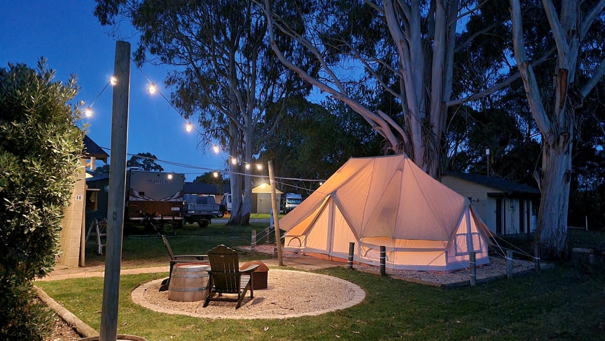 Patirkite puikų komforto ir gamtos derinį Penola Coonawarra Caravan Park glamping palapinėse. Mėgaukitės karališko dydžio lovomis su kokybiška patalyne, elektrinėmis antklodėmis ir jaukiomis atsarginėmis antklodėmis, o grupėms, kuriose yra daugiau nei du žmonės, galima pristatyti sulankstomas lovas. Kiekvienoje palapinėje yra lauko laužavietės su mediena, kad vakarai po žvaigždėmis būtų įsimintini. Šiuolaikinės ypatybės apima šaldytuvą, mikrobangų krosnelę, kavos aparatą, virdulį, šildytuvą ir būtiniausius valgomojo reikmenis, pvz., stalo įrankius ir stiklinius indus, o vonios kambarys yra vos už kelių žingsnių.