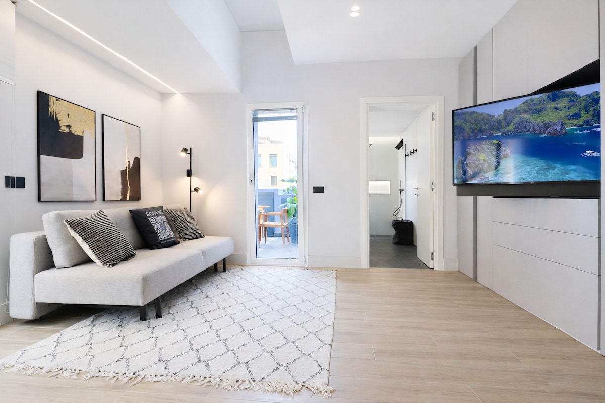 Prabangus apartamentas: šviesi terasa, dizainas ir komfortas