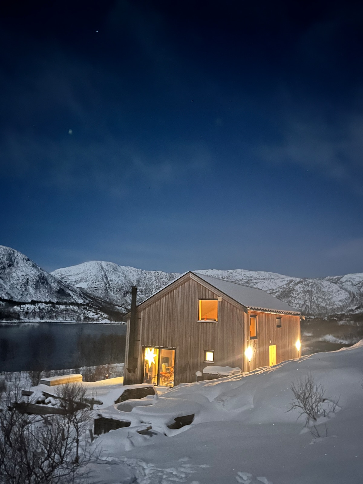 Moderni trobelė, idiliškai įsikūrusi tarp didingų kalnų šiaurinėje Norvegijos pakrantėje, kur jūros vėjas susitinka su kalnų oru. Ši trobelė, apsupta nuostabios gamtos netoli Lofoteno ir turtingos laukinės gamtos, kviečia jus į ramybės ir nuotykių oazę. Su dideliais panoraminiais langais, kurie įrėmina gamtos grožį, ir moderniais patogumais, trobelė yra puikus atspirties taškas tyrinėti gamtą arba tiesiog mėgautis tyla. Potyris ištisus metus!